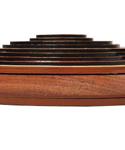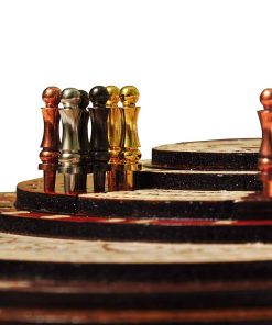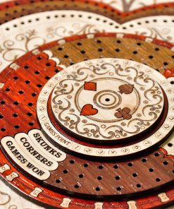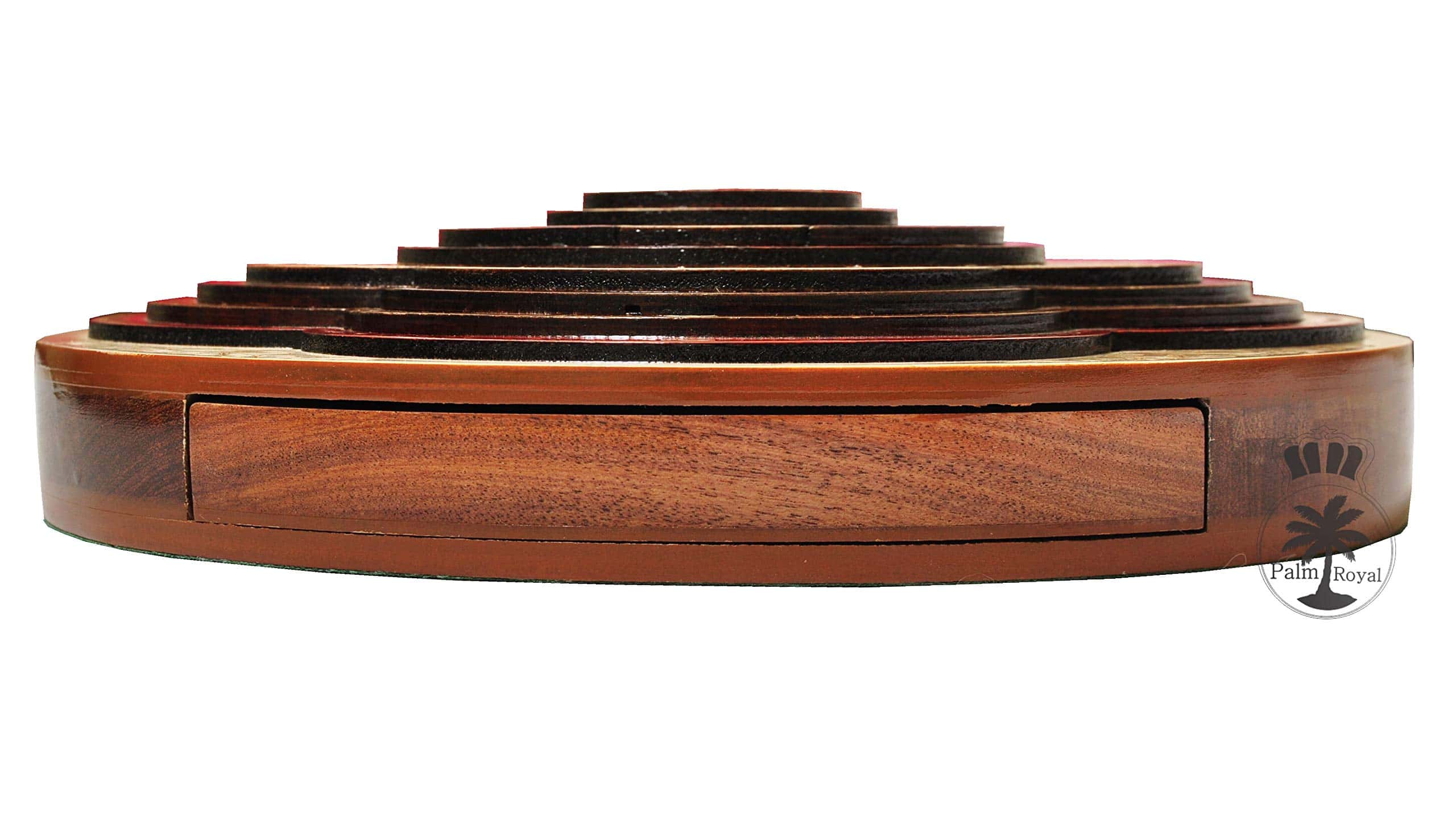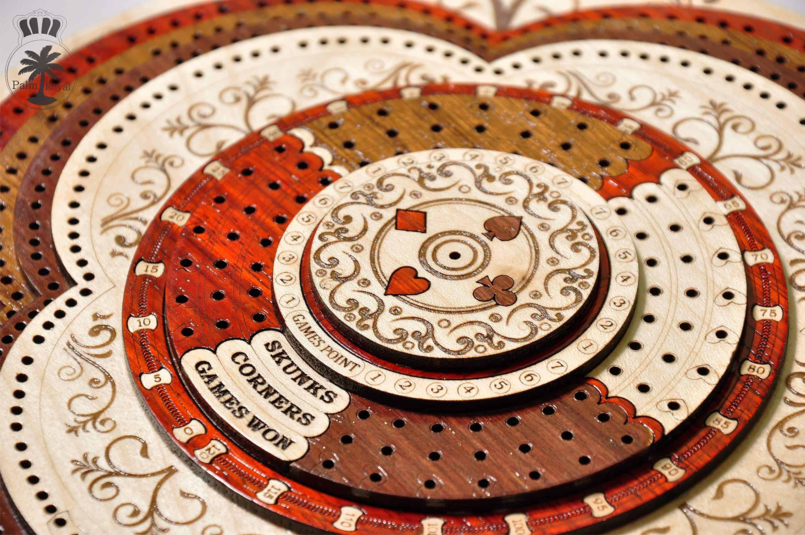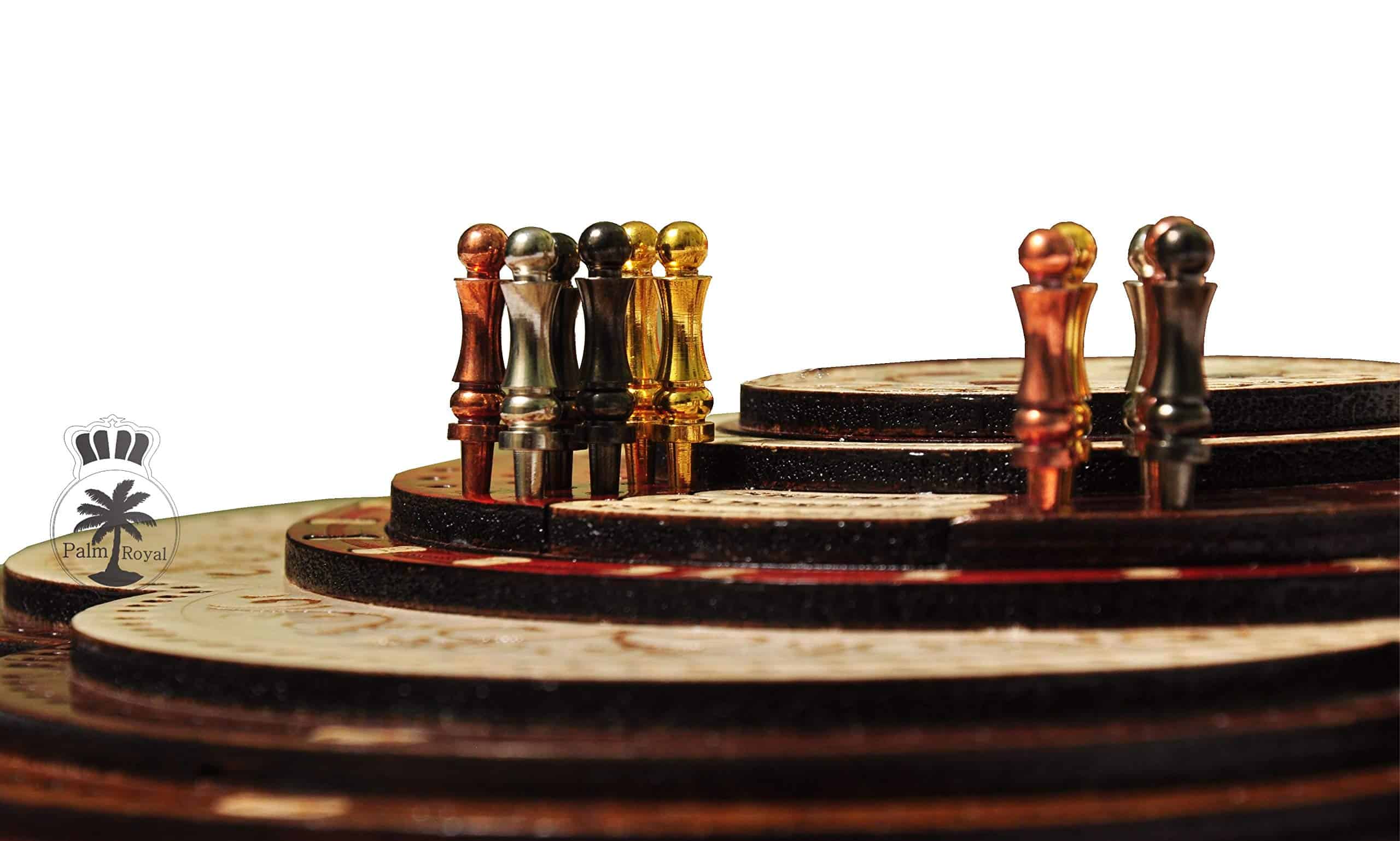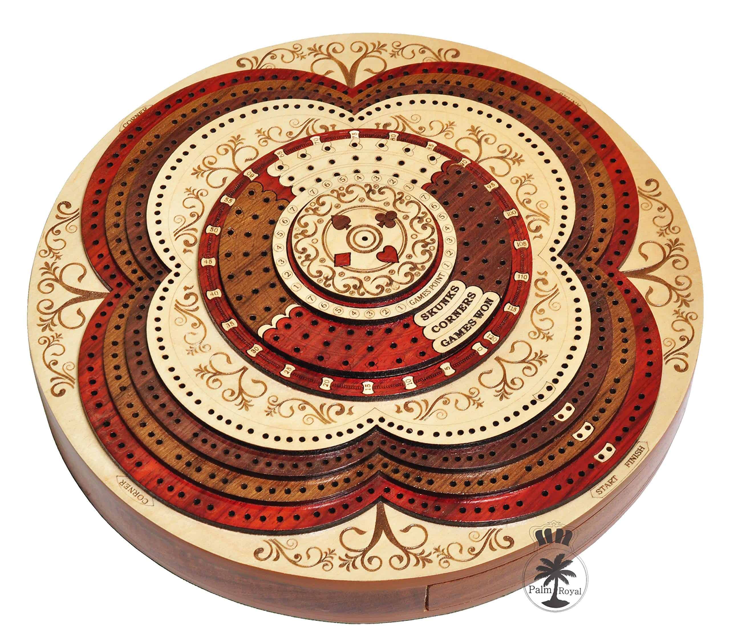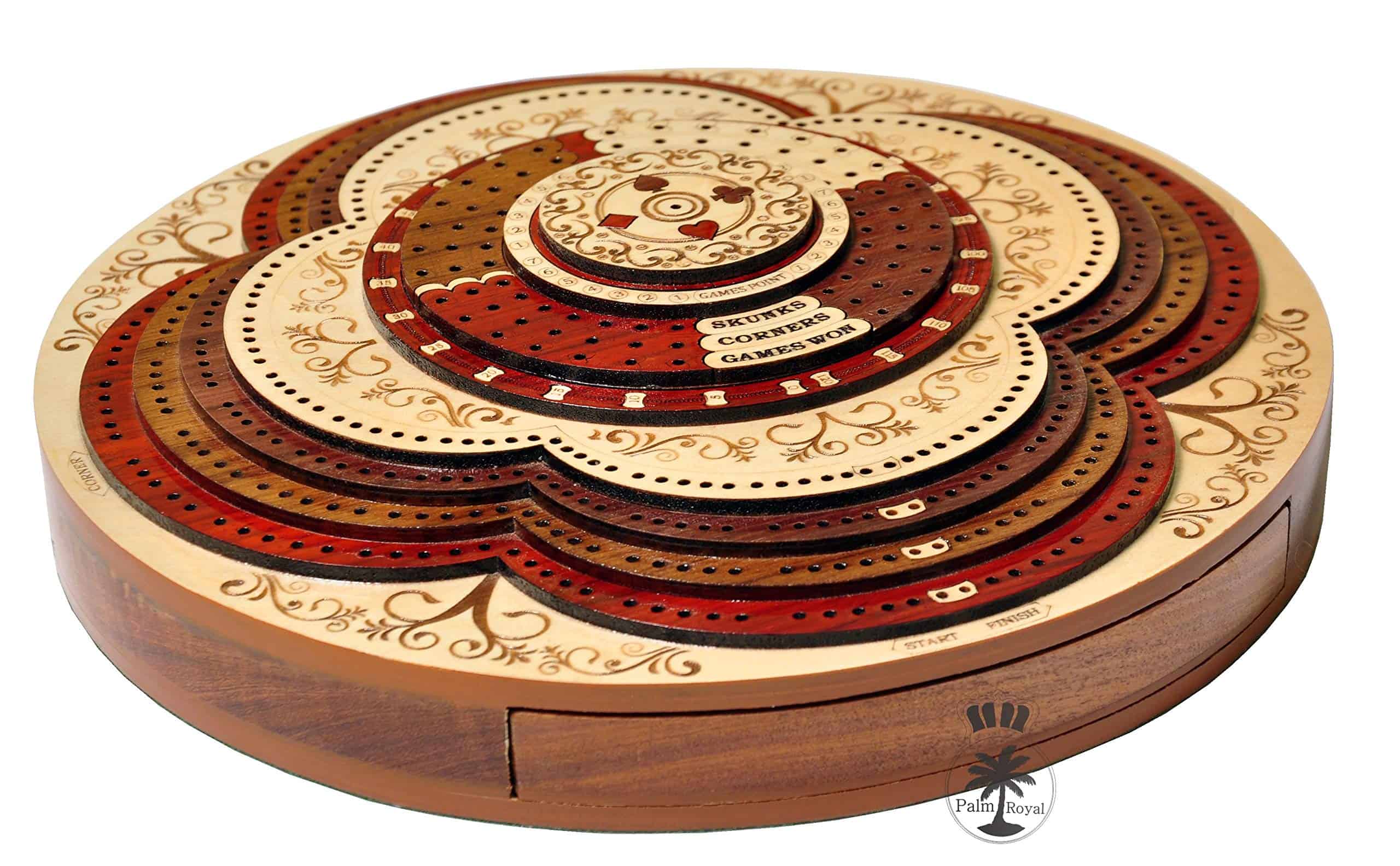 PALM ROYAL HANDICRAFTS presenta un exclusivo Juego de Cribbage 3D de 4 Pistas (120 casas) en Forma Redonda con Pista de Flor con cajón de empuje. Todas las pistas están posicionadas en pasos, cada pista sobre la otra. El tablero de forma redonda tiene cajones para guardar las cartas de juego y clavijas de latón. El cajón se puede abrir desde ambos lados del juego y tiene cerraduras de bola que evitan que se caiga. El tablero de cribbage 3D hecho a mano se ha realizado en 8 pasos. Las primeras 4 etapas están destinadas a las pistas de juego del 1 al 4 y otros pasos están destinados a Notaciones alfanuméricas, Juegos ganados, esquinas, skunks. La siguiente tabla muestra la descripción detallada de pasos y maderas. Dirección de los Pasos de abajo hacia arriba Paso 1: Pista de Juego Uno en Madera de Bloodwood. Paso 2: Pista de Juego dos en Madera de Teak. Paso 3: Pista de Juego tres en Madera de Rosewood. Paso 4: Pista de Juego cuatro en Madera de Maple y hay un hermoso diseño grabado Paso 5: Pista de Notaciones alfanuméricas incrustada con maple en Bloodwood Paso 6: Consta de Juegos Ganados, Esquinas y Skunks que están grabados en madera de maple y maderas de bloodwood rosewood teak y maple. Paso 7: Anillo numérico de madera de maple. Paso 8: Diseño grabado en madera de maple. Maderas Naturales: NO USAMOS serigrafías ni ninguna otra impresión para crear números. Todas las pistas están hechas en maderas naturales en colores originales.