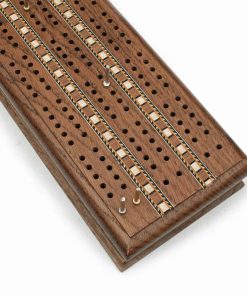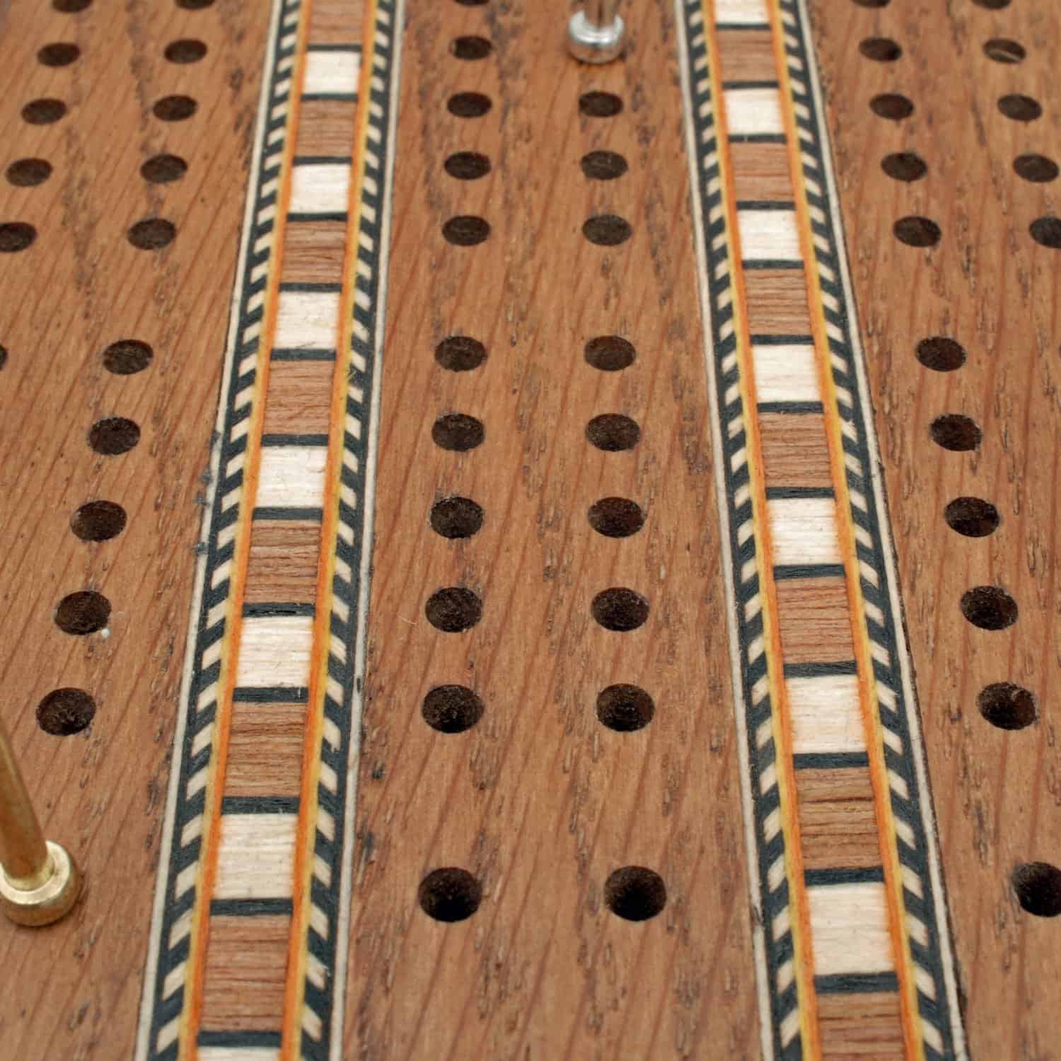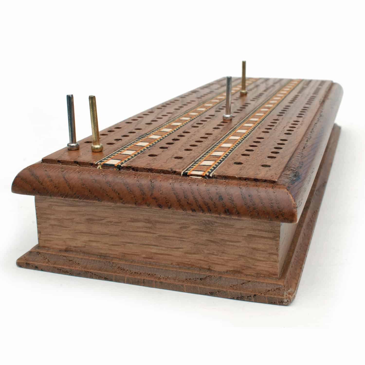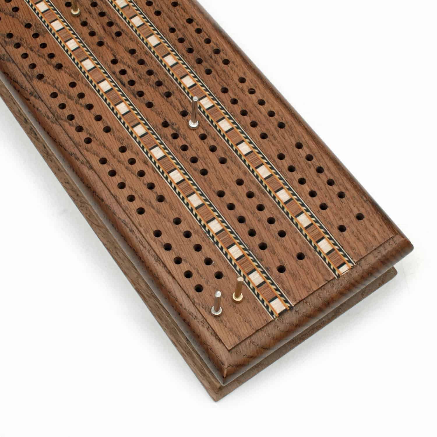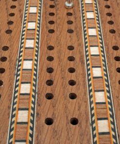 ¡Uno de nuestros juegos de cribbage más exclusivos! Este tablero de roble macizo con 3 carriles es valorado por su hermosa madera de roble manchado y sus incrustaciones elaboradas. También cuenta con espacio para almacenar 2 barajas de cartas y 6 clavijas metálicas cuando no se está utilizando. ¡Un juego de cribbage para pasar de una generación a la siguiente!