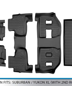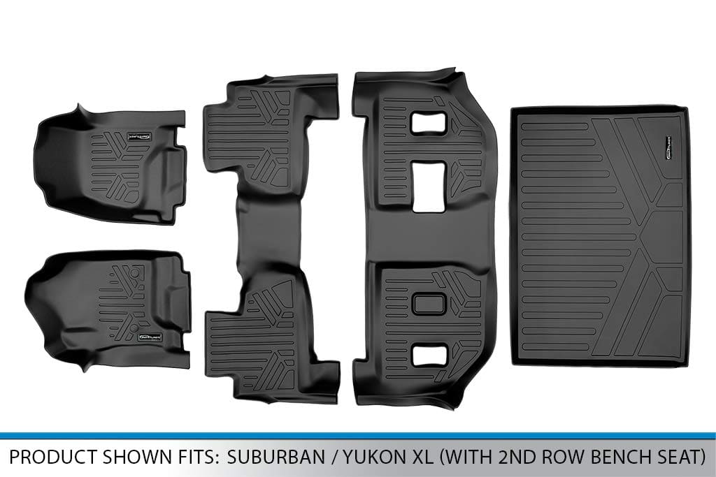 Juego de tapetes de piso y protector de maletero de MAXLINER compatible con Suburban/Yukon XL 2015-2020 (con asiento de 2da fila tipo banco). Este juego de tapetes de piso y protector de maletero ofrece protección para todo clima, resistente a las manchas que le da a tu interior de automóvil, van, camión o SUV una apariencia de primera clase mientras protege su valor de reventa. El ajuste personalizado garantiza que se adapte perfectamente a tu vehículo, protegiendo el piso de alfombra de los elementos climáticos, derrames y cualquier desorden. La superficie texturizada y resistente al deslizamiento hecha de materiales 100% reciclables ofrece protección 100% sin olores que es fácil de limpiar con manguera o usando jabón y agua. Este juego de tapetes de piso y protector de maletero es fuerte, duradero, fácil de instalar y está respaldado por una garantía.