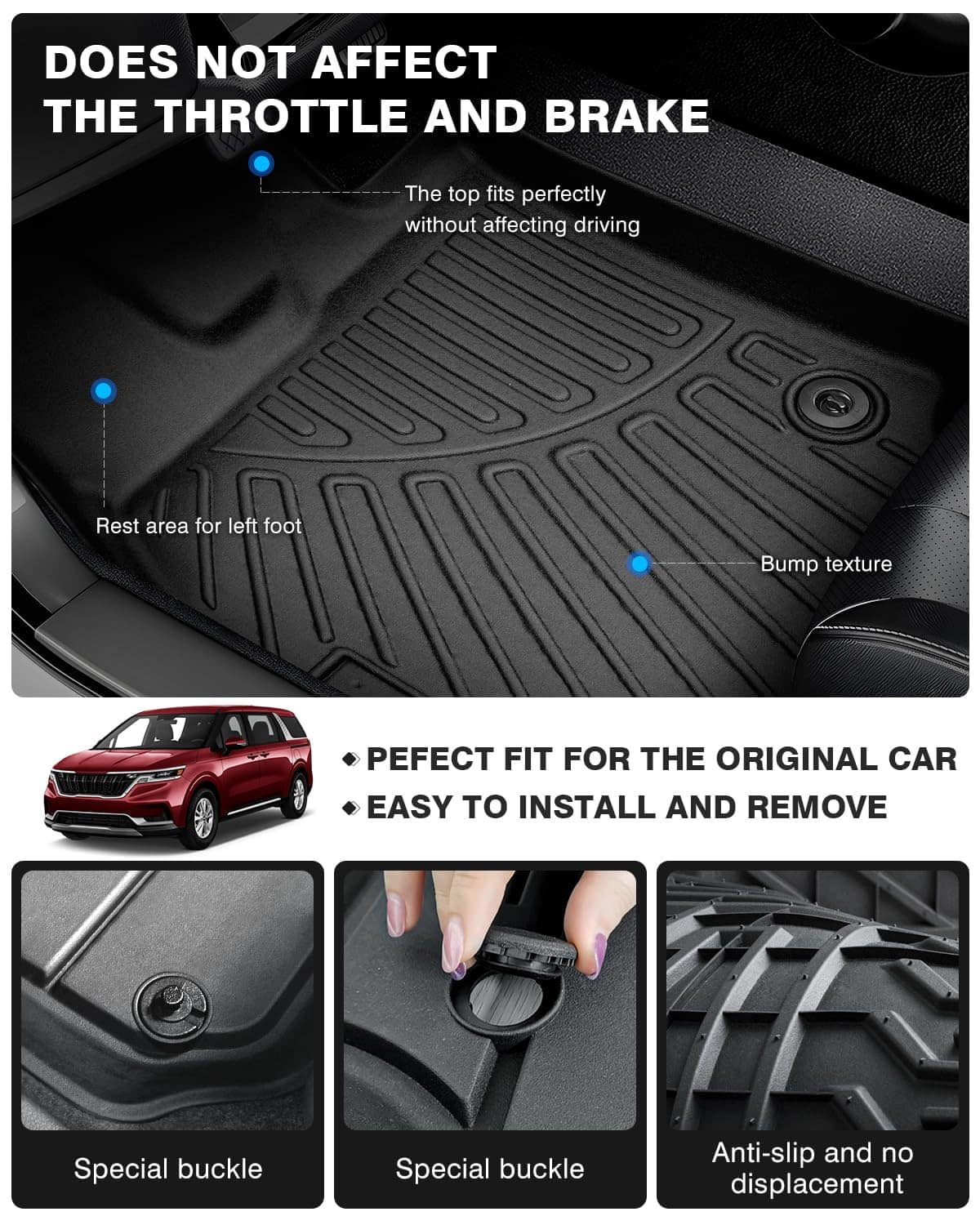 Los tapetes Powerty están diseñados específicamente para el KIA Carnival 2022 2023 2024, asegurando un ajuste perfecto sin interferir con los pedales de freno. Están fabricados con material TPE de alta calidad, que garantiza la seguridad y protección del medioambiente. Estos tapetes para piso de auto son adecuados para todo tipo de clima, resistiendo altas temperaturas sin olores desagradables y manteniendo su flexibilidad incluso en condiciones de congelación. Su diseño con borde elevado protege eficazmente el piso de su vehículo de líquidos derramados y suciedad. Además, su fácil limpieza y instalación los convierten en una solución conveniente para mantener su auto limpio y protegido. No dude en contactarnos si tiene alguna pregunta, nuestro equipo de atención al cliente está disponible las 24 horas del día para ayudarlo.