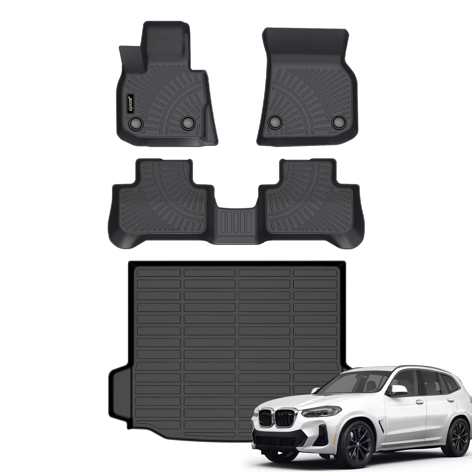1. Ajuste preciso: juego de tapetes para pisos Jenofa BMW X3 2018-2024 que incluye: 1 tapete para el asiento del conductor, 1 tapete para el asiento del pasajero delantero, 1 tapete para la segunda fila y 1 tapete para el maletero. La tecnología de escaneo láser 3D garantiza un ajuste exacto a los datos originales de BMW X3, asegurando un ajuste cómodo y maximizando la protección completa para el piso original de tu automóvil y el área de carga.