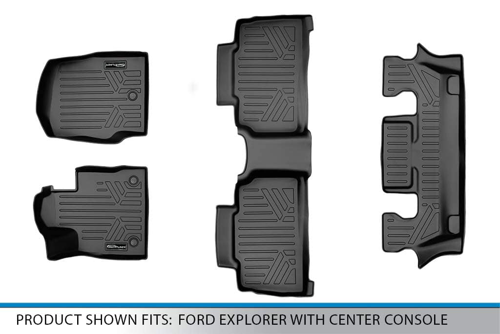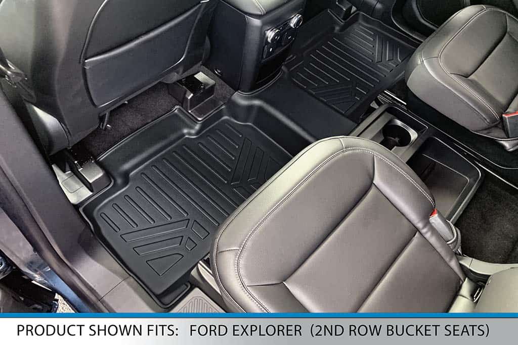 Juego de tapetes SMARTLINER a medida para 3 filas en color negro, diseñado específicamente para ser compatible con el modelo de 2020-2023 Ford Explorer. Estos tapetes ofrecen una protección resistente a las manchas contra todos los elementos, incluyendo nieve, barro, arena y agua salada. El ajuste personalizado con labio elevado y diseño hecho con tecnología innovadora de escaneo de vehículos asegura que se adapten perfectamente para proteger el piso de alfombra de su vehículo del clima, derrames y cualquier desorden. Además, son fáciles de limpiar simplemente con una manguera o limpieza localizada con un trapo húmedo con agua y jabón. Mejore la apariencia general del interior de su automóvil con nuestro diseño texturizado, resistente al deslizamiento y elegante. Además, nuestra protección es 100% inodora y respetuosa con el medio ambiente, ya que está hecha con una mezcla de plástico de caucho y polietileno 100% reciclable.