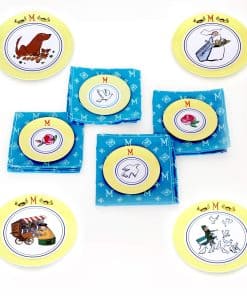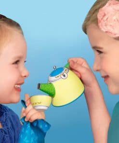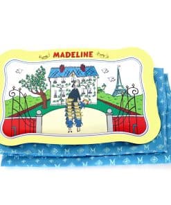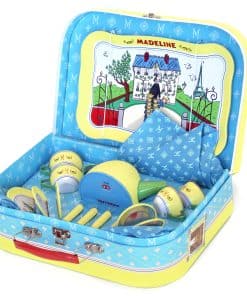 Nuestro set deluxe incluye una bandeja, una tetera con tapa, cuatro tazas, cuatro platillos y cuatro platos, cada uno con una ilustración diferente del libro, cuatro cucharas y cuatro servilletas y mantel azul con patrón de monogramas, creando la fiesta perfecta para cuatro. Cada una de las 24 piezas del Juego de té de lata Madeline se guarda de forma segura dentro de una maleta de cartón resistente impresa a todo color. La maleta del Juego de té de lata Madeline está decorada por dentro y por fuera, con un asa roja brillante y un cierre seguro, y cuenta con los sellos de viaje de los destinos internacionales favoritos de Madeline.