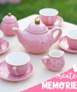 – Juego de té para niñas rosa con lunares dorados