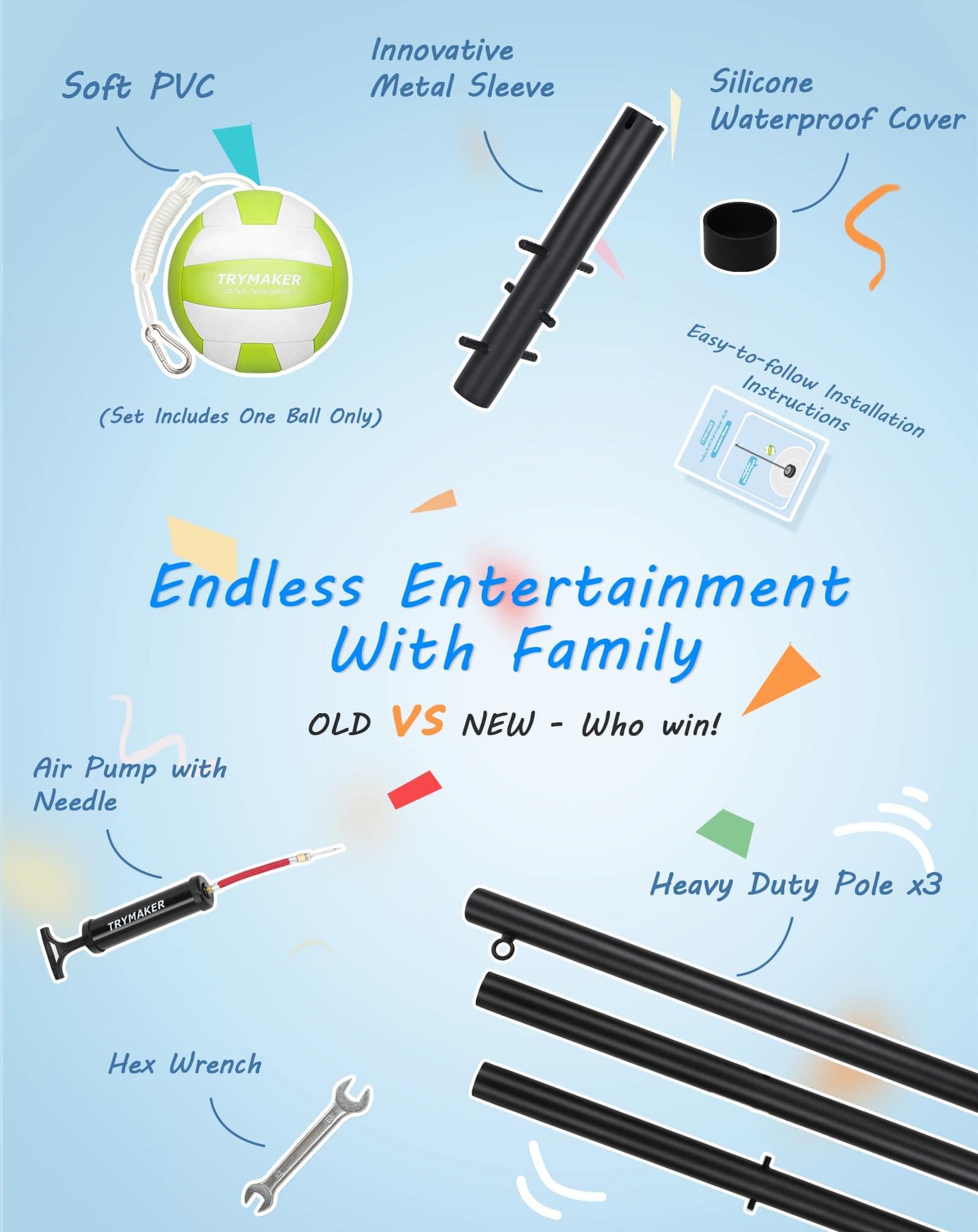 Fácil de instalar: listo para usarse una vez configurado. El set completo de pelota y cuerda y poste de tetherball de Trymaker incluye: 3 postes interconectables, una base de metal, una llave inglesa, una pelota, una cuerda, una bomba de aire fácil de usar, un mosquetón y un fácil de seguir instrucciones de instalación.