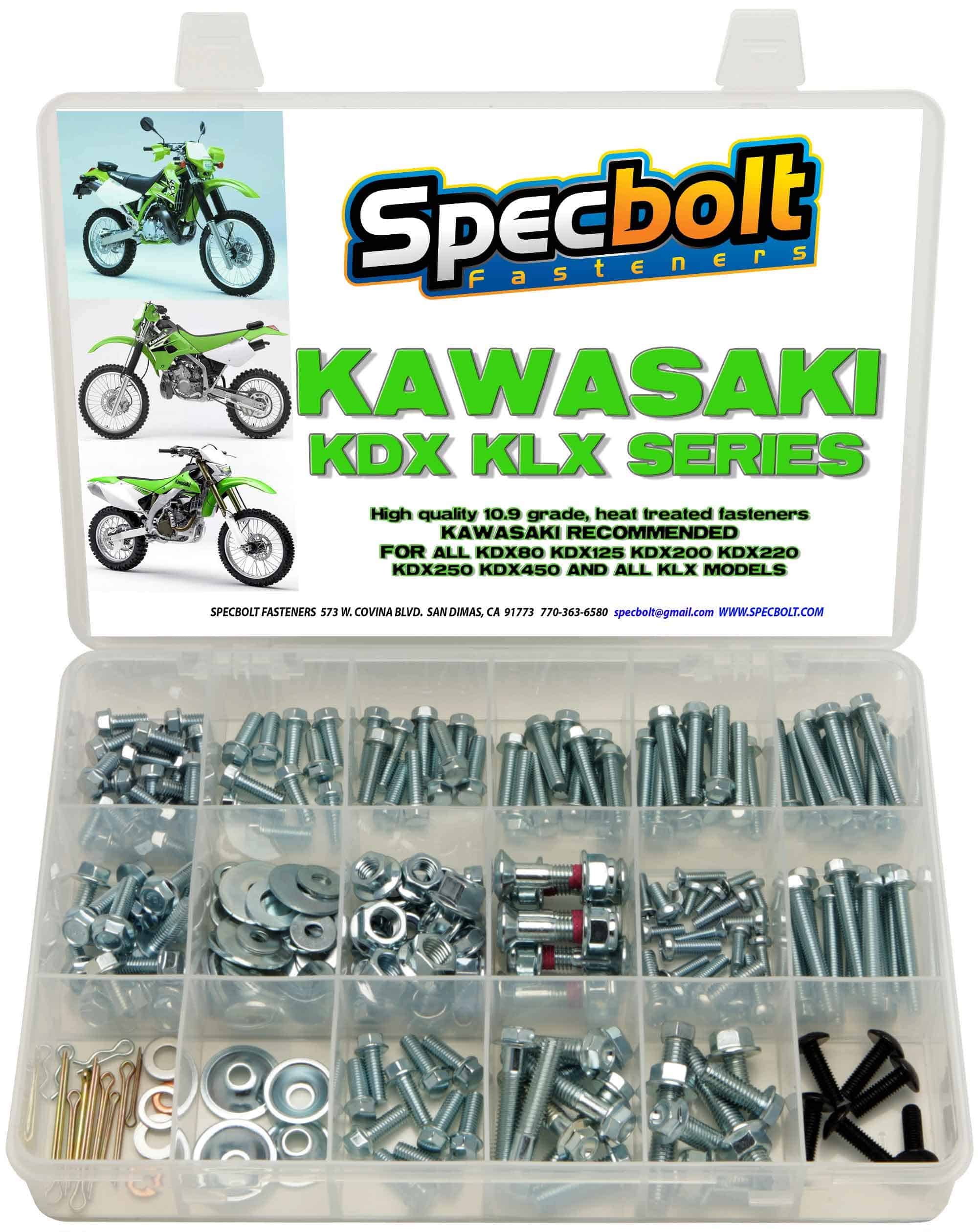 Este kit de 250 piezas de Specbolt te ahorrará muchos viajes a la concesionaria en busca de ese perno OEM especial necesario para todos los modelos Kawasaki KDX 2 y 4 tiempos enfriados por aire o líquido. Esto incluye los modelos KDX80 KDX125 KDX175 KDX200 KDX220 KDX250 y KDX450. Tu kit de pernos incluirá la cantidad justa de pernos de brida que combinan con la fábrica, tuercas con brida, tuercas de bloqueo, un completo juego de pernos para piñón, arandelas de sellado, arandelas para guardabarros, tornillos Philips para cabezal, pernos Allen, pasadores partidos y más. Casi todo lo que necesitas para realizar un mantenimiento básico y cuidar tu motocicleta. Surtido de pernos utilizados para plástico, guardabarros, carrocería, motor, chasis, asiento, tanque de combustible, controles, cuenco y montaje del carburador, escape, tubo, silenciador, radiadores, manillares, componentes del brazo oscilante, placas para deslizarse y más. Estos pernos cumplen o superan los estándares de calidad de los originales de tu máquina. Una adición perfecta al kit de herramientas del corredor y un imprescindible para los mecánicos aficionados.