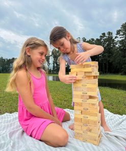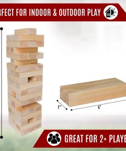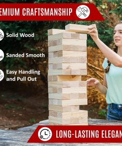 ¡Ten cuidado con esta Torre de Tumbar Gigante! Nuestras piezas de madera maciza de alta calidad están lijadas suavemente para un uso fácil. El objetivo del juego es construir una torre y comenzar a quitar bloques desde abajo y colocarlos en la parte superior. ¿Puedes tener éxito o la torre se vendrá abajo? Las piezas tienen un tamaño de 7.5×2.5×1.5″