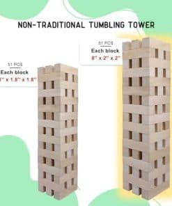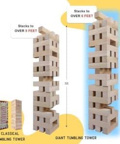 Es muy gratificante pasar tiempo de calidad con amigos y familiares. Además, puedes fortalecer el vínculo incorporando juegos. Para lograrlo, necesitas la torre de tumbling gigante. La torre de madera gigante de Gothink proporciona entretenimiento y diversión tanto para niños como para adultos. Además, estas torres gigantes de tumbling están hechas de materiales de madera de alta calidad y duraderos. También tienen superficies lisas para evitar que ocurran accidentes y lesiones. Además, son fáciles de usar. MÁS DESAFÍO; MÁS DIVERSIÓN: Ayuda a los más pequeños a desarrollar mejor desde la coordinación ojo-mano, el pensamiento lógico, la estrategia, la concentración, hasta las habilidades motoras finas, con un juego de mesa interior para niños que agrega una capa de desafío adicional a toda la diversión. Ideal para niños y adultos, el juego desafía a los competidores a sacar cuidadosamente un bloque y colocarlo encima de la pila. ¡Pero cuidado! ¡Coge el equivocado y tendrás una pila de ladrillos! Descubre todos los divertidos y beneficios educativos de esta batalla de construcción atemporal. CÓMO JUGAR EL JUEGO: Los juegos de patio de madera tumbling pueden ser jugados por 2 o más jugadores. El jugador que construyó la torre comienza primero. Toma un bloque de cualquier nivel de la torre y reemplázalo en la parte superior para hacer la torre más alta. ¡Se turnan moviendo bloques hasta que alguien tire la torre de madera! Especificaciones Material: 51 Piezas de Bloques de Madera (Pre-lijados) Tamaño del Bloque: 7.9 x 2 x 2 pulgadas Estuche de Transporte de Oxford Duradero: 17.7 x 11.8 x 10.67 pulgadas Peso: 15.4 libras Color: madera natural