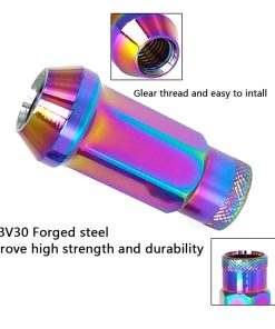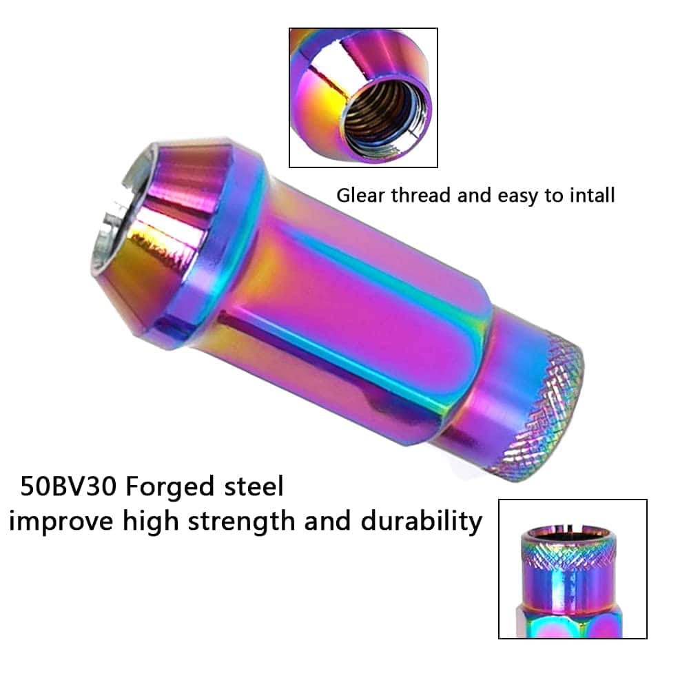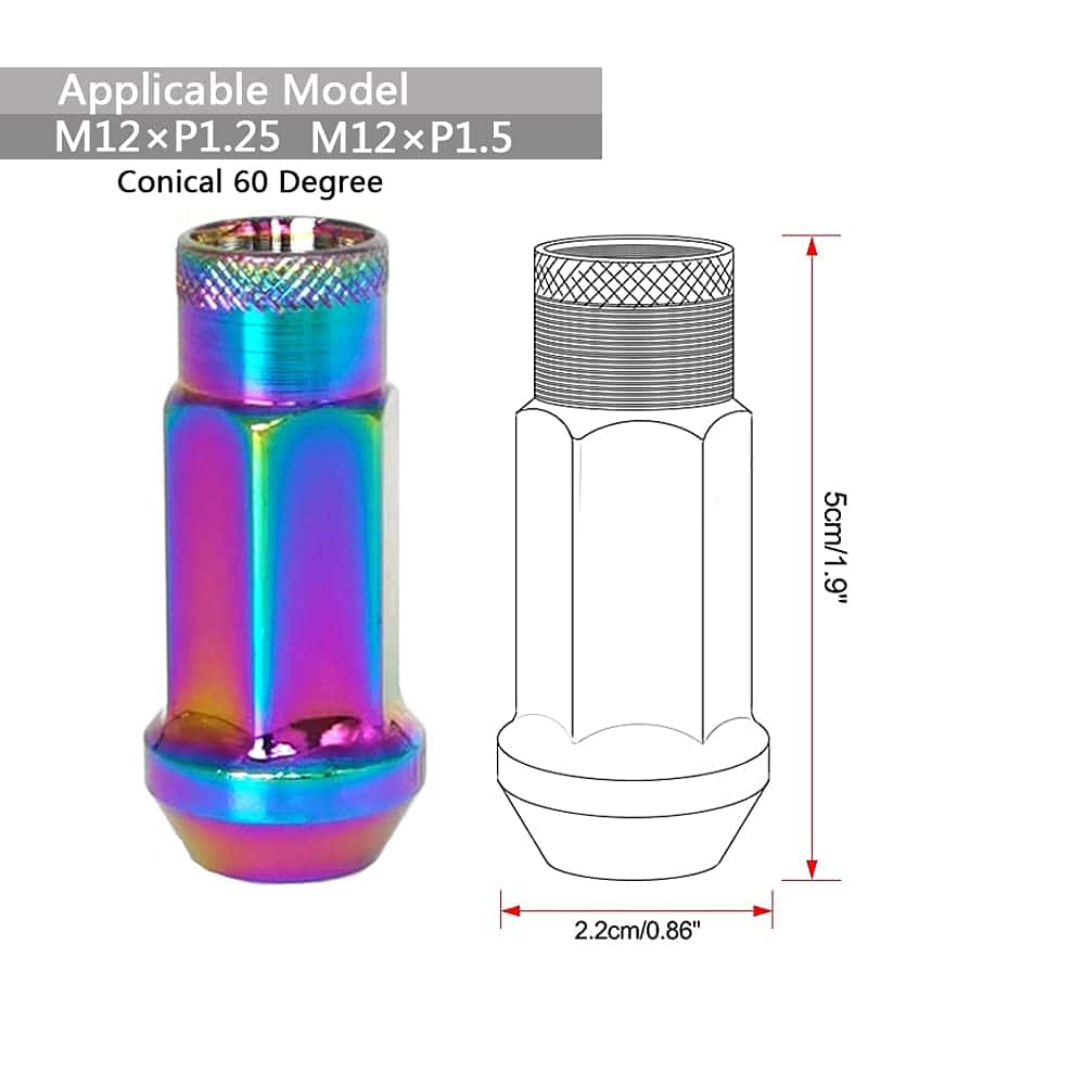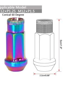Juego de Tuercas para Ruedas SOROPARTS M12x1.5 de Asiento Cónico Abierto, Tuerca de Bloqueo Forjada de Carrera, 20 Piezas 2 Juegos en Total 22 Piezas y 1 Llave de Vaso para Tuercas (Multicolor M12 x P1.5) – M12 1.5 Modelo adecuado: M12 1.5 es para HONDA, TOYOTA, MITSUBISHI, MAZDA, LEXUS (excepto LX), ACURA, HYUANDAI, KIA, JAGUAR, LOTUS, FORD Focus / Forex / Mondeo / Yibo / Tigre Alado / Carnival, GM BUICK Angkola / Angkway / Yinglang / Yulang / Excelencia / Nuevo Regal / Sail, CHEVROLET Avion / Cruze / Chuangku / Kopaqi / Corvette / Kovoz / Épica, CADILLAC-ATS. Modelo compatible con M12 1.25: M12 1.25 es compatible con NISSAN, SUBARU, SUZUKI, KOLEAO, JAGUAR. Para otros modelos no incluidos, por favor, confirme las especificaciones de la tuerca de rueda usted mismo antes de comprar. Longitud y material: La altura de la tuerca del cubo es de 1.89″ (48 mm). Acero 50BV30 forjado, color anodizado para mejorar la resistencia y durabilidad. Colores y rendimiento: La tuerca está tratada con aluminio resistente a los ácidos, y el tinte penetra en el pequeño agujero y el color se tiñe directamente. Hay opciones de rojo, dorado, azul, morado, titanio, arcoíris, rojo y azul, y negro. La parte roscada de la tuerca también está firmemente fijada en el color, y el revestimiento no se cae fácilmente, reduciendo la oxidación en el uso a largo plazo. La tuerca es un consumible, por favor, apriétela durante 100 kilómetros. Diferentes lotes pueden tener aberración cromática. Tecnología: El diseño de una sola pieza aporta a las tuercas de rueda la ventaja de Anti-desprengamiento y las hace estéticamente agradables garantizando una conducción segura en comparación con otro diseño de dos piezas.