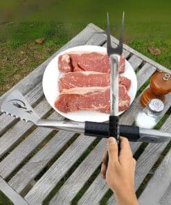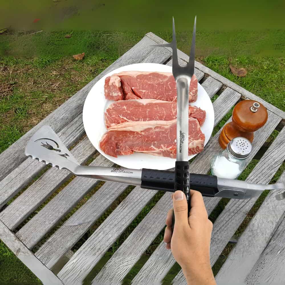 HERRAMIENTAS VERSÁTILES DE PARRILLA – Experimenta la máxima comodidad con el Dragon Claw y las Super Tongs. El Dragon Claw funciona tanto como un tenedor para parrilla como un volteador de carne, mientras que las Super Tongs combinan las características de unas pinzas y una espátula. Estas herramientas de parrilla multifuncionales son perfectas para voltear, levantar y girar todo tipo de carnes y verduras con facilidad.