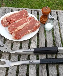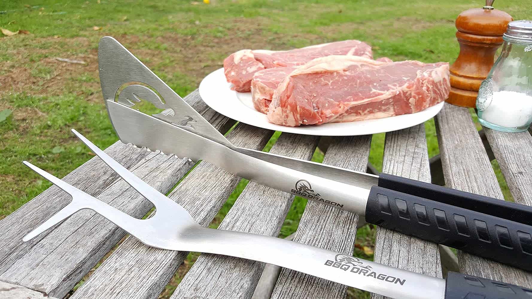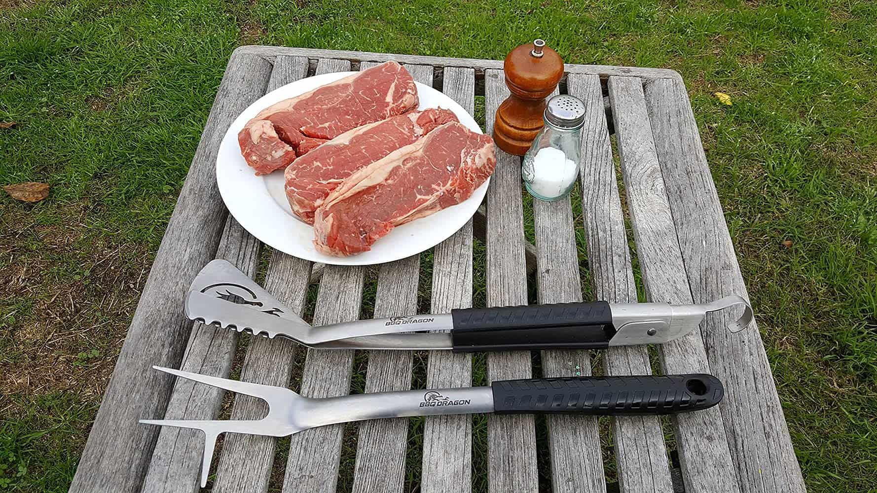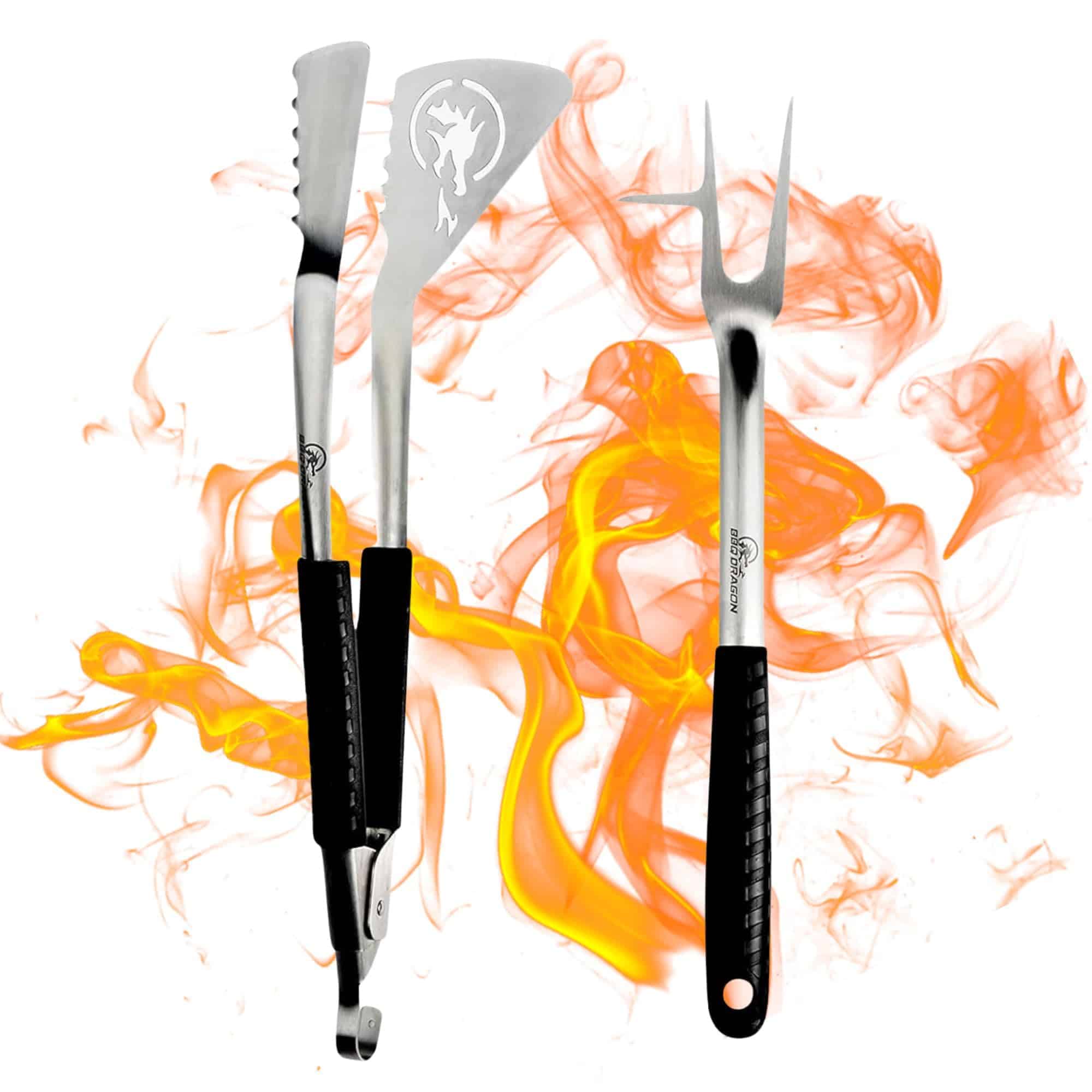 PERFECTAS PARA TODAS LAS NECESIDADES DE PARRILLA – Ya sea que estés asando carne, pescado o hamburguesas, este set de utensilios para barbacoa tiene todo lo que necesitas. Utiliza el diente lateral del Dragon Claw para voltear fácilmente o los dientes estándar para levantar asados pesados. Las Super Tongs son ideales para voltear hamburguesas, pescado, salchichas y verduras, proporcionando todo lo que necesitas para una experiencia de parrilla impecable.