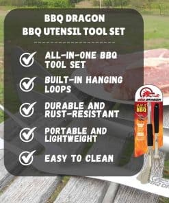 CALIDAD PREMIUM Y DURABILIDAD – Fabricadas en acero inoxidable de alta resistencia, nuestro set de herramientas de parrilla BBQ es resistente y duradero. Estas herramientas resisten la oxidación y soportan los elementos, garantizando un rendimiento duradero. El logo de BBQ Dragon está orgullosamente grabado en cada herramienta, y los mangos texturizados proporcionan un agarre seguro y cómodo, convirtiendo este set de barbacoa en una elección fiable para cada sesión de parrilla.