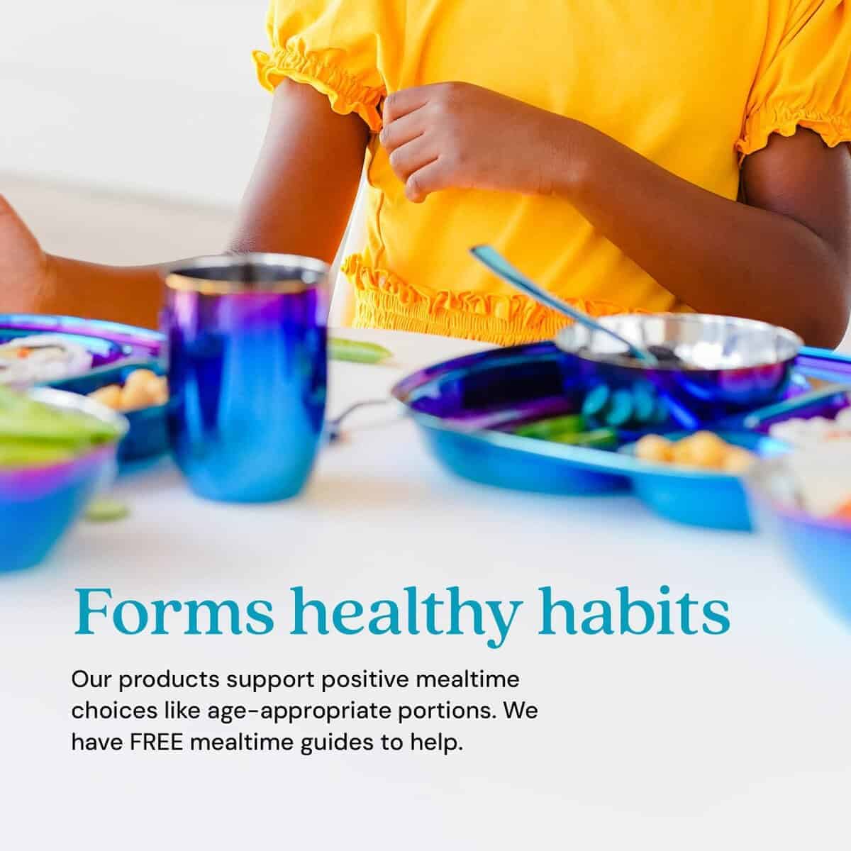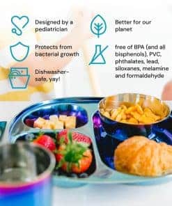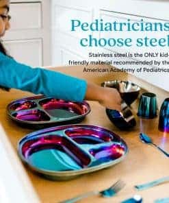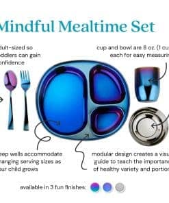 Ahimsa Mindful Mealtime Sets hace que la hora de la comida sea divertida con coloridos y vibrantes platos de acero inoxidable para niños que a los niños les encantan. Incluye un plato de acero inoxidable para niños con divisiones, un vaso de acero inoxidable para niños de 8 oz y un pequeño tazón para bebés, y cubiertos para niños (1 tenedor para niños, 1 cuchara para niños). Los juegos de platos y tazones de acero inoxidable para niños de Ahimsa están diseñados cuidadosamente para la salud y seguridad de los niños. Fabricado con acero inoxidable 304 18/8 de alta calidad apto para alimentos garantiza que sustancias químicas dañinas no se transfieran a los alimentos de su hijo sin regusto a silicona jabonosa. Ahimsa, creada por una pediatra y madre, se creó para fomentar la variedad, la porción y los hábitos saludables para los niños de cualquier edad. Nuestros juegos de platos y tazones para niños no tóxicos son fáciles de limpiar, aptos para lavavajillas, apilables, irrompibles, sin riesgo de pelado. Todos los platos para niños y platos de acero inoxidable de Ahimsa no contienen BPA (y todos los bisfenoles), PVC, ftalatos, plomo, siloxanos, melamina y formaldehído, lo que los convierte en los favoritos de los padres, combinando seguridad y diversión con un diseño que promueve comidas saludables y equilibradas. Los juegos de vajilla para niños de acero inoxidable son el regalo ideal para padres primerizos y familias eco-conscientes. Este juego de regalo empaquetado de forma sostenible es tan seguro como hermoso. Es el regalo perfecto que muestra que te preocupas por la calidad, el medio ambiente y la salud de los niños. Todos los platos de acero inoxidable de Ahimsa en nuestro Kit de Comida Consciente están dimensionados para crecer con cada niño y se convierten en el regalo perfecto para un baby shower apreciado por las nuevas mamás. Los platos de acero inoxidable para niños de Ahimsa están diseñados para durar generaciones. Los padres elogian la durabilidad de los platos de Ahimsa, diseñados para soportar el uso diario incluso por el niño más enérgico. La resistente construcción metálica es irrompible, lo que convierte a nuestros juegos de platos y tazones de acero inoxidable para niños en una inversión a largo plazo en la salud y el bienestar de su hijo. Por favor, contáctenos en nuestro sitio web si tiene problemas con su pedido y estaremos encantados de ayudarle.