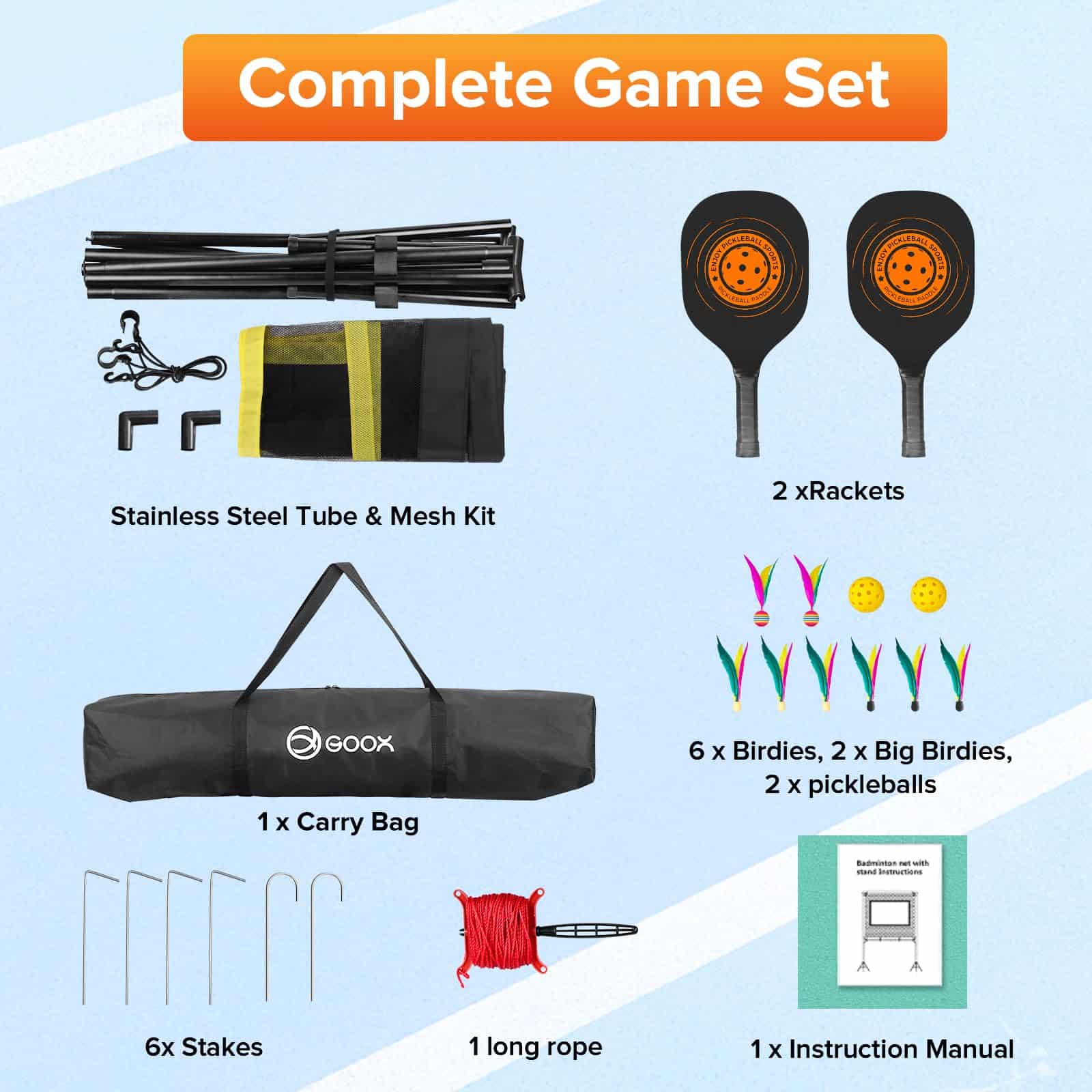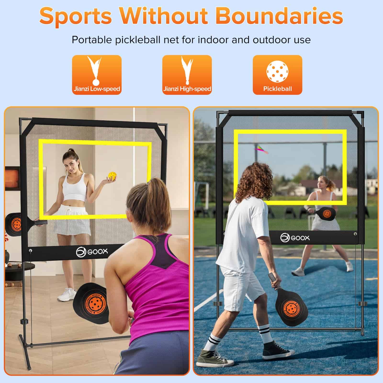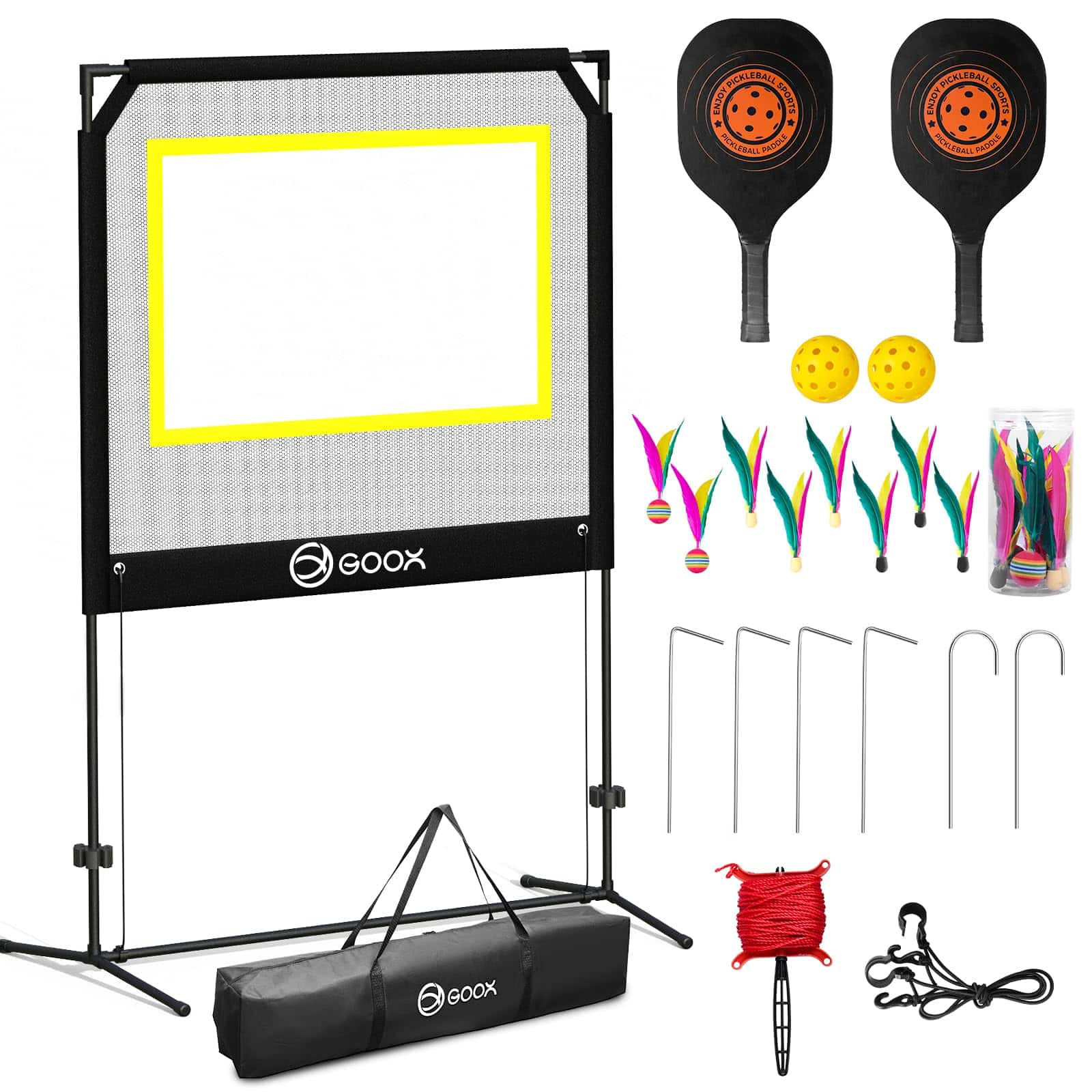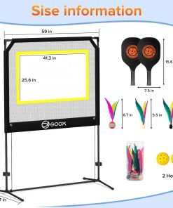 EXCITING SPORTS FUSION: ¡Experimenta la emoción de varios deportes en un único set! Un revolucionario juego de remo que combina elementos de pickleball, tenis, bádminton y tenis de mesa. Ofreciendo emocionantes variaciones, el juego único te mantendrá regresando por más. ¡Perfecto para familias e individuos que buscan una emocionante actividad interior o exterior! ALL-IN-ONE PORTABLE KIT: ¡Disfruta de una fácil configuración con nuestro kit completo que incluye una red portátil, palas de grado profesional y una variedad de pelotas incluyendo pickleballs y jianzi. Perfecto para reuniones en el patio trasero, diversión en el césped o juego en interiores, las reglas de juego personalizables elevan la diversión, asegurando diversión interminable para todos! VERSATILE INDOOR AND OUTDOOR PLAY: Lluvia o sol, invierno o verano, GOOX Sport está diseñado para todos los entornos. Con volantes especialmente diseñados para diferentes condiciones. Disfruta de la diversión en tu sala de estar, ya que nuestra altura de 7 pies 6 pulgadas se adapta perfectamente a cualquier hogar, permitiendo jugar independientemente del clima exterior. QUICK SETUP & CONVENIENT STORAGE: Configura tu juego en solo 3 minutos con nuestro marco resistente a la oxidación para una experiencia sin problemas. Además, se incluye una bolsa de almacenamiento conveniente para un fácil transporte al parque, playa, patio trasero o cualquier otro lugar para diversión sobre la marcha!. ENDLESS RALLIES FOR EVERYONE: Confeccionadas con materiales de alta calidad, nuestras palas y volantes están diseñados para durabilidad y rendimiento duradero. ¡Es la combinación definitiva de diversión y habilidad para todas las edades!