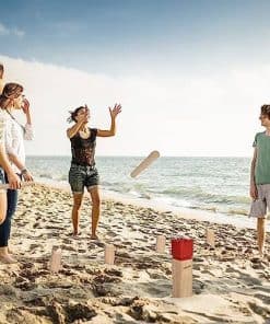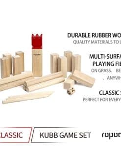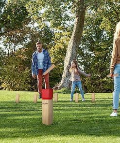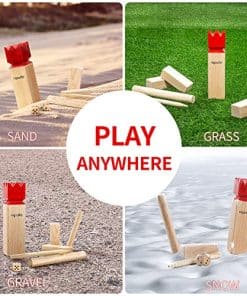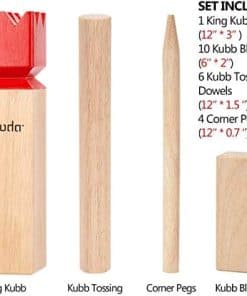 Kubb (pronunciado KOOB) es un clásico juego de césped sueco. Durante la época vikinga, era muy popular. Hoy en día, el juego también es conocido en todo el mundo y rápidamente se está convirtiendo en uno de los juegos de césped al aire libre más populares. Kubb se juega generalmente en césped, pero también se puede jugar en la playa, tierra o incluso nieve. Es un juego clásico al aire libre, de patio y playa de ajedrez vikingo. Kubb ofrece mucha diversión para todas las edades. Características: 1. Nuestro Juego de Kubb está hecho de madera de caucho de calidad para garantizar que sea irrompible y resistente a los golpes. 2. Las personas pueden llevar fácilmente nuestro set de juego de Kubb a cualquier lugar para disfrutar de momentos divertidos. Como el patio, la playa y el campamento. 3. Nuestro set de Kubb es perfecto para muchos eventos especiales, incluyendo reuniones familiares, barbacoas y fiestas. Este juego es la mejor elección para unir a las personas y pasar un tiempo feliz. Consejos: 1. Secar con una toalla o pañuelo después de tocar el agua. 2. No tocar líquidos corrosivos.
