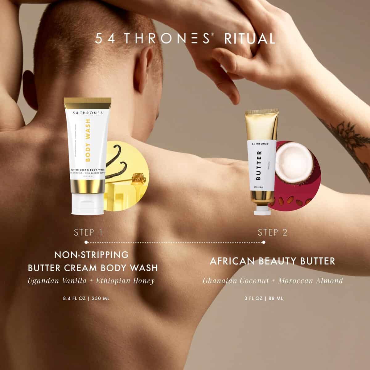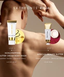 El Juego Para Él de 54 Thrones combina cuidado atento con lujo sobrio en un ritual de cuidado de la piel de dos piezas diseñado para trabajar de manera armoniosa juntas. Comienza con el Body Wash Crema No Despojante, batido a una consistencia esponjosa e infundido con aceites africanos de origen natural. Limpia sin sensación de sequedad, ofrece beneficios ligeros exfoliantes y deja una suave fragancia a Vainilla Ugandesa y Miel Etíope. Después de enjuagar, alcanza la compacta Manteca de Belleza Africana elaborada con mantecas de karité de doble origen de Ghana y Uganda, para un toque final de hidratación. Esta mezcla nutritiva es ideal para usar en codos, rodillas, manos o en cualquier área que necesite soporte para piel seca. El aroma sutil de Coco Ghanés y Almendra Marroquí de la manteca añade un toque cálido a tu cuidado diario. Ya sea relajándote o saliendo, este juego ofrece un cuidado conveniente y amigable para viajar sin comprometer el rendimiento. Intégralo en tu rutina diaria como una manteca corporal hidratante para mujeres y hombres y como un bálsamo corporal y crema hidratante confiable, ayudándote a cuidar tu piel con intención y sencillez.