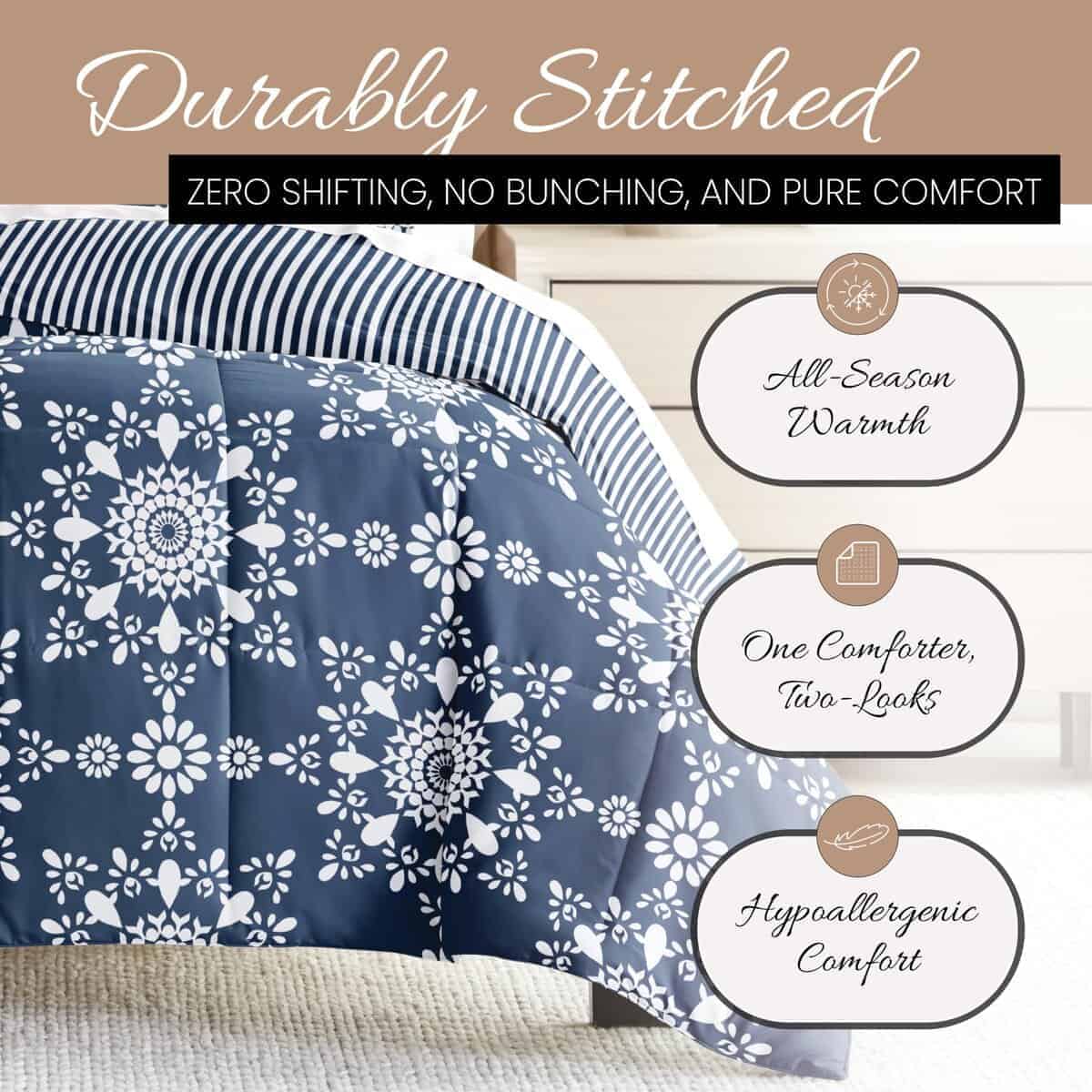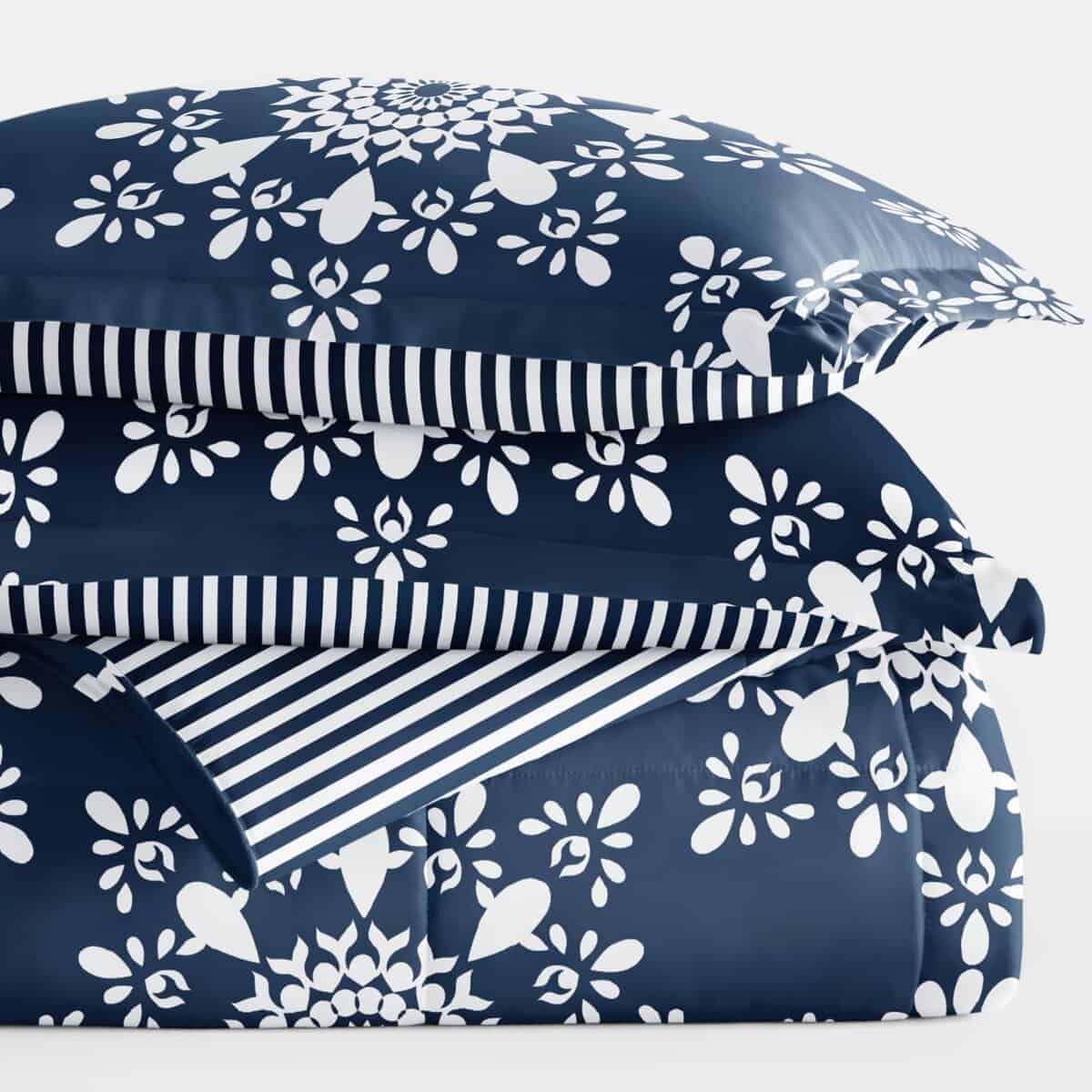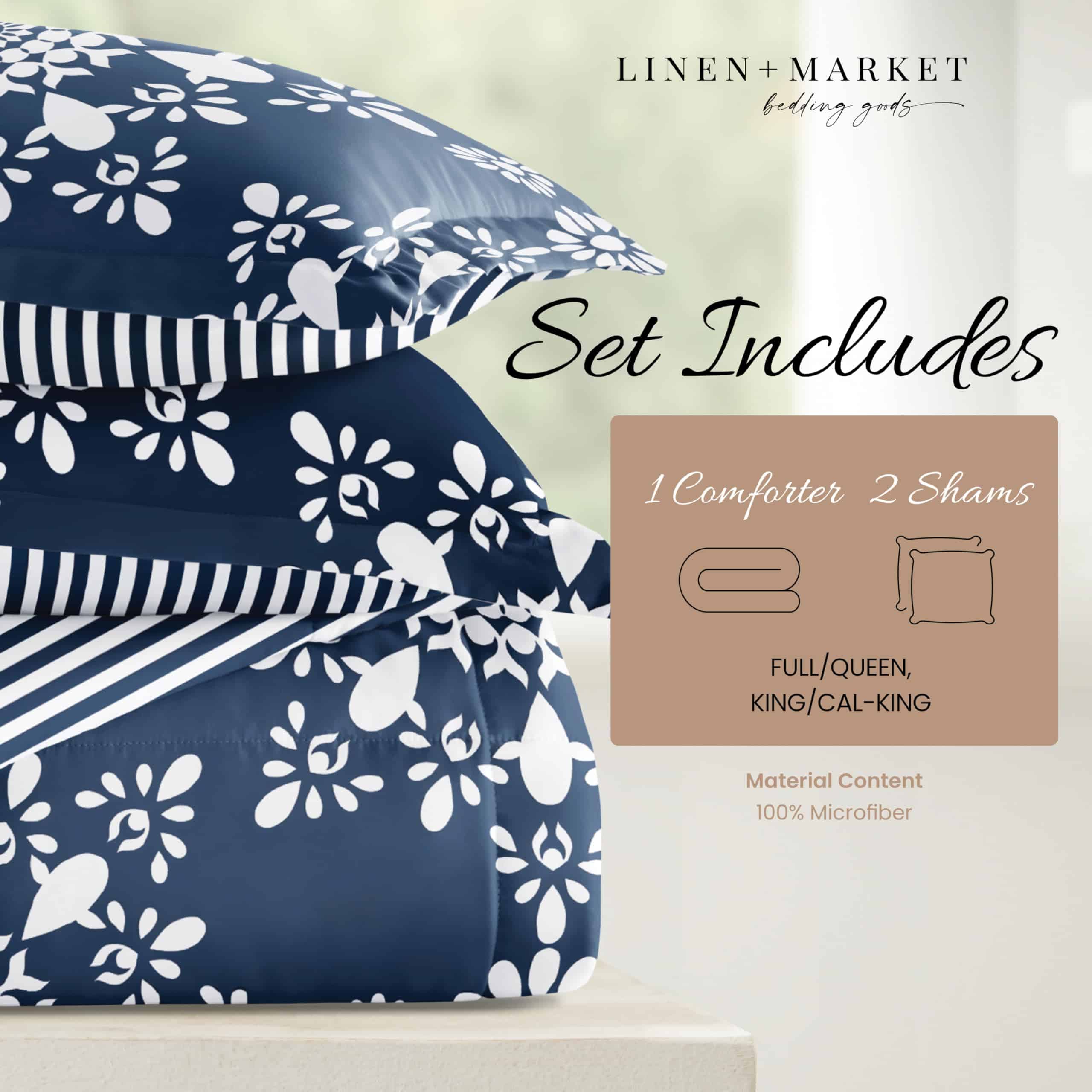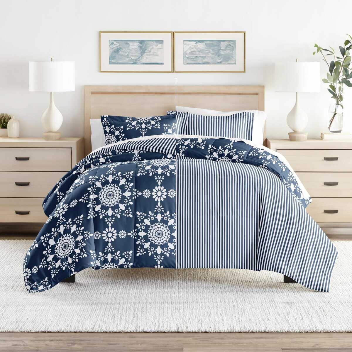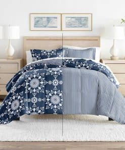 Este juego de edredón tamaño queen de Linen Market es la opción perfecta para quienes buscan un edredón suave, ligero y de alta calidad. El set incluye un edredón reversible tamaño queen y 2 fundas de almohada a juego. El diseño elegante con medallones de margaritas en color navy añadirá un toque de sofisticación a tu dormitorio. Disfruta de la comodidad y el estilo con este conjunto de edredón de calidad premium.