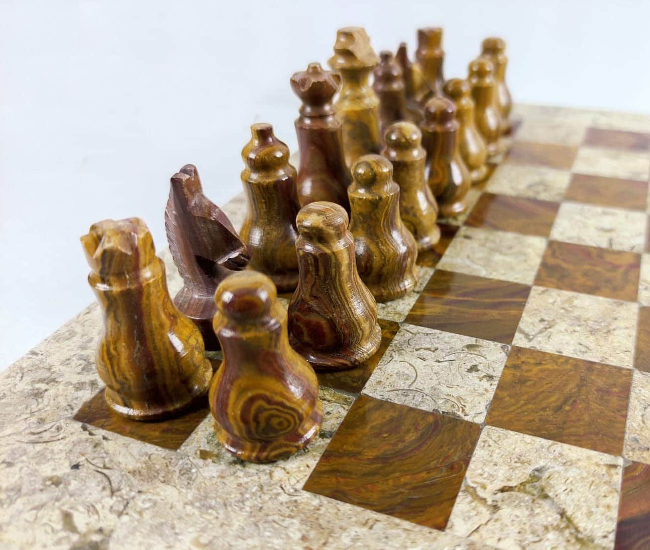 MATERIAL: Este juego de ajedrez está completamente hecho a mano con mármol ónix de alta calidad. Tablero de Ajedrez y Figuras de Ajedrez están completamente pulidos
