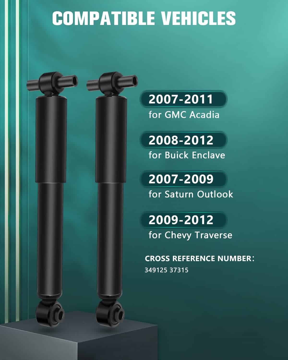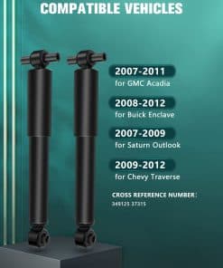 Descripción larga de los amortiguadores traseros AUTOMUTO compatible con Enclave 2008-2012 / Traverse 2009-2012 / Acadia 2007-2011 / Outlook 2007-2009. Este juego de amortiguadores traseros de alta calidad cuenta con una alta resistencia del pistón, sellos de aceite de calidad premium y un diseño optimizado para una mayor durabilidad. La instalación directa sin modificación permite una fácil sustitución de los amortiguadores originales. Con un efecto de amortiguación efectivo, estos amortiguadores mejoran la comodidad de conducción y la vida útil de los componentes del sistema relacionados. Se incluye un par de amortiguadores traseros nuevos y probados en el paquete para una instalación rápida y conveniente.