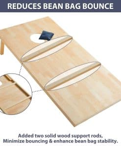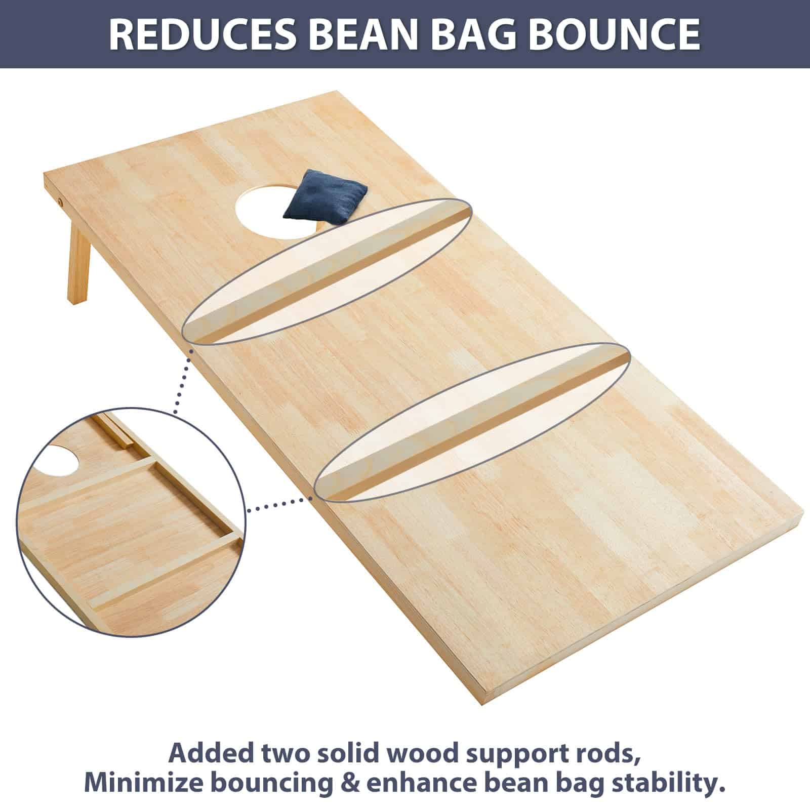 5. Reducción de rebote: Se han añadido dos varillas de soporte de madera maciza adicionales debajo de los dos lados del juego de tablero de cornhole de madera para reducir el rebote y la deformación, mejorando la estabilidad durante el juego y mejorando la experiencia general de juego en los juegos exteriores de verano.