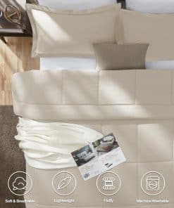 Hecho con un relleno de microfibra de alta calidad y un diseño acolchado para mayor suavidad, volumen y durabilidad, el juego de edredón tamaño queen ofrece la cantidad justa de calidez para una comodidad durante todo el año. El juego de edredón ha sido certificado de acuerdo con los rigurosos requisitos del Estándar 100 de OEKO-TEX, asegurando que está libre de sustancias nocivas y seguro para ti y tu familia. Este juego de ropa de cama de alta calidad y duradero es una opción segura y cómoda. El edredón está hecho de una sola pieza de poliéster, que es más duradero que la mayoría de los edredones similares en el mercado. Elaborados con tecnología de costura en caja, nuestros juegos de edredón aseguran que el relleno permanezca en su lugar, sin preocupaciones de fugas de relleno o hilos sueltos. El juego de edredón completo incluye 1 edredón (82×86 pulgadas), 2 fundas de almohada (20×26 pulgadas). Consejos Cálidos: Debido a que el edredón viene en un empaque sellado al vacío, se recomienda lavarlo y secarlo a baja temperatura para que se infle el edredón antes del primer uso. O puedes exponerlo al sol y darle golpecitos suavemente, luego se esponjará nuevamente después de unas horas. Los juegos de ropa de cama son lavables a máquina, lo que puede ahorrarte tiempo y energía. Para una suavidad durante todo el año y prevenir la formación de bolitas, es altamente recomendable lavarlo en ciclo suave con agua fría, secarlo al sol o secarlo en secadora a baja temperatura cuando sea necesario. Deja que nuestras sábanas de edredón sigan proporcionando a ti y a tu familia un sueño acogedor.