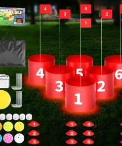 La calidad de los materiales utilizados en este set es insuperable. Los hoyos de golf están fabricados con materiales de primera calidad que ofrecen mayor grosor y durabilidad para resistir mejor el uso. Las varillas para las banderas son de fibra de vidrio, lo que las hace más duraderas y garantiza un prolongado tiempo de uso. El set incluye todo lo necesario para comenzar a jugar de inmediato, desde los hoyos y las banderas hasta las luces led, pelotas, cajas de tees, estacas de tierra, frisbee, tarjeta de puntuación y bolsa de almacenamiento.