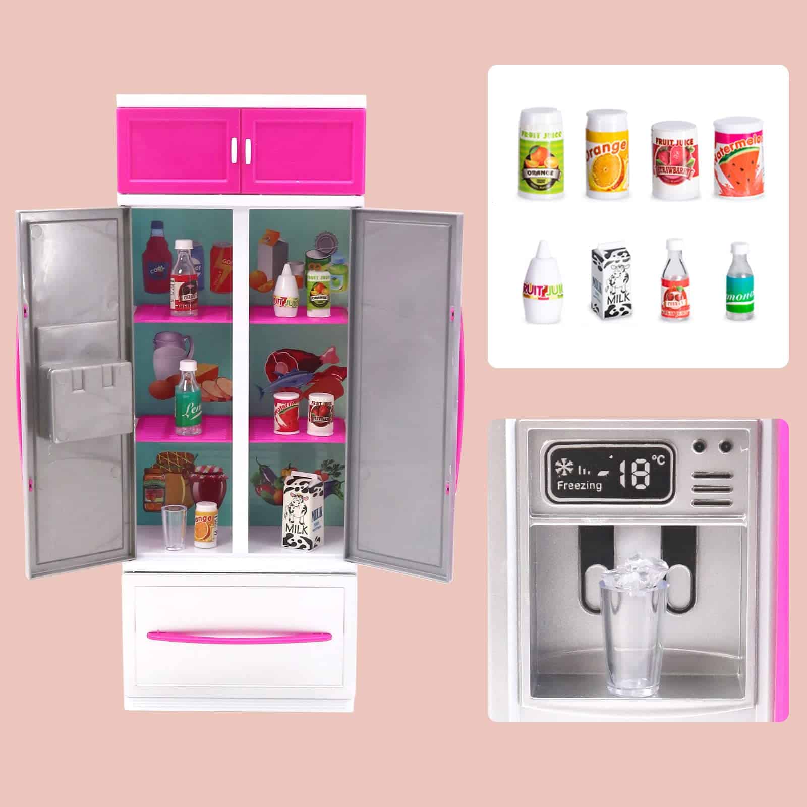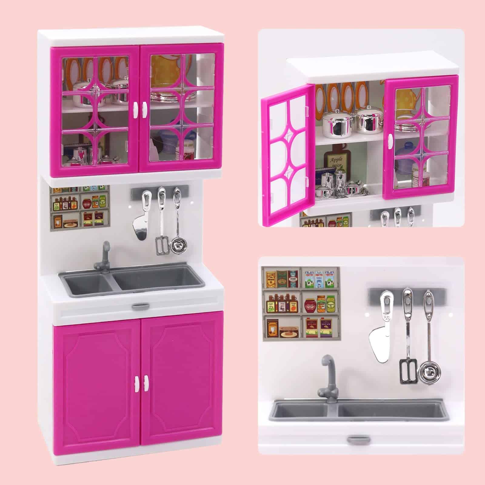 4. PERFECTO PARA MUÑECAS DE 11-12 PULGADAS: Se adapta perfectamente a muñecas de 11-12 pulgadas. También incluye mini tazas de juguete, platos, tetera, comida, ollas, sartenes ¡y mucho más! Todo disponible para su uso y almacenamiento en múltiples lugares dentro de todo el conjunto de cocina moderna.