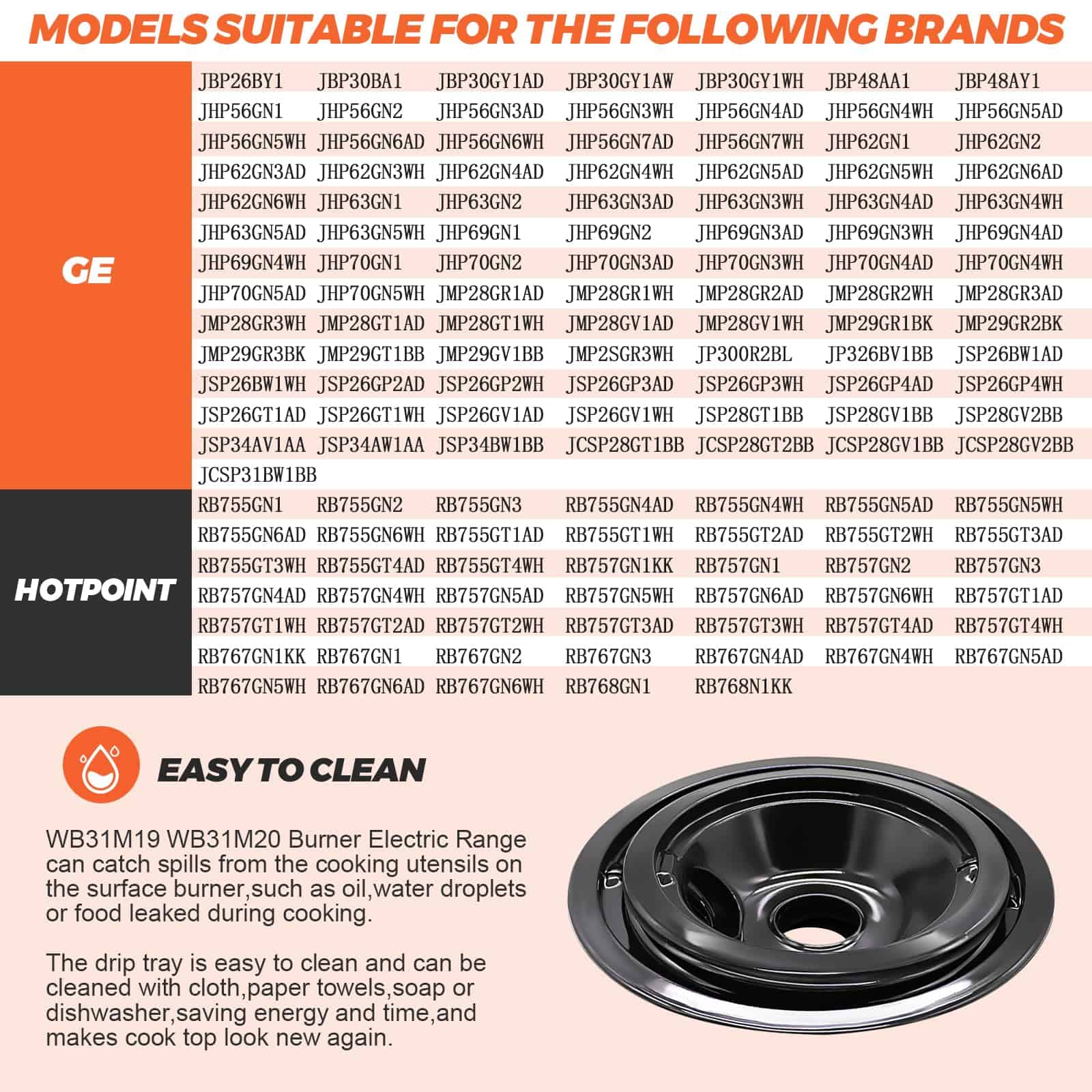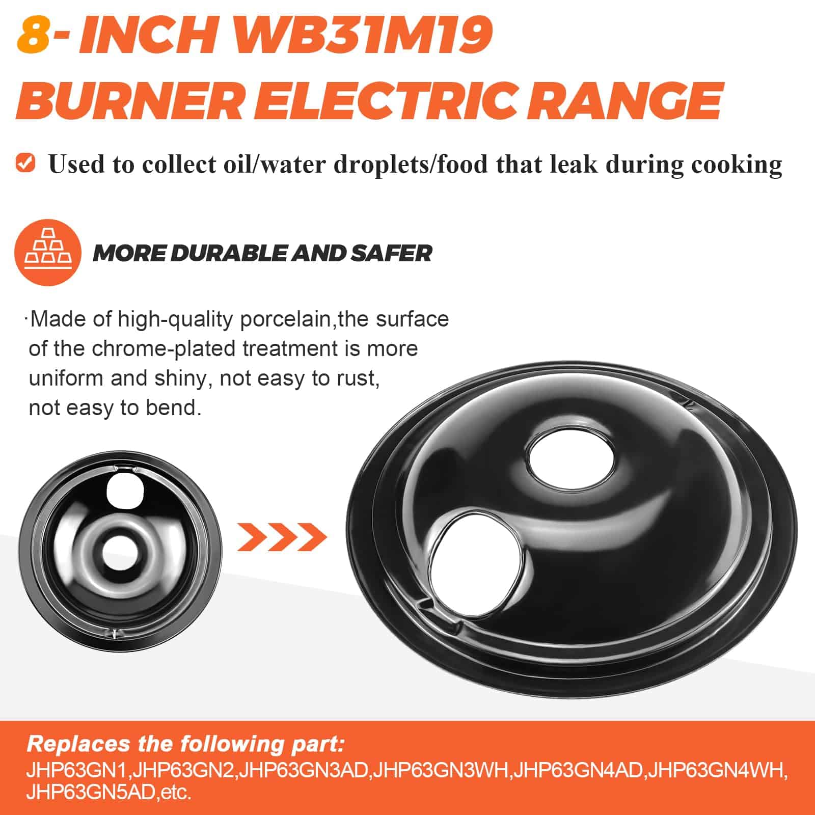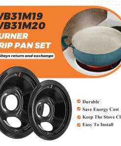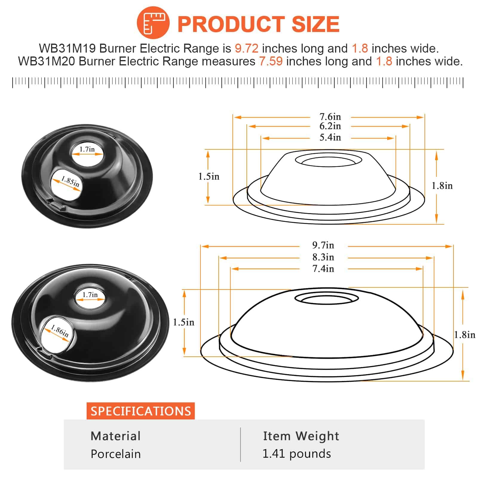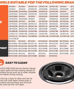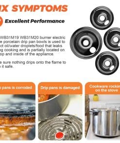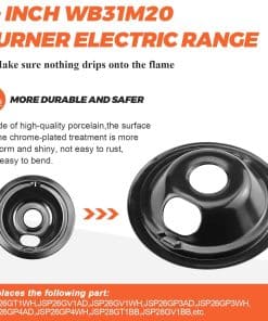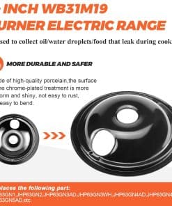 DESCRIPCIÓN DEL PRODUCTO: El tazón de 8 pulgadas mide 9.75 pulgadas de diámetro y el tazón de 6 pulgadas mide 7 5/8 pulgadas de diámetro. Color negro de porcelana. ¡Pulir cuidadosamente cada detalle y esforzarse por brindar a cada cliente un mejor uso y disfrute! INCLUYE: 1 Tazón de Goteo para Quemador WB31M19 3 Tazones de Goteo para Quemador WB31M20 CONSEJOS DE INSTALACIÓN: El tazón de goteo WB31M19 y WB31M20 recoge derrames de utensilios de cocina en el quemador de la superficie. Espere hasta que la superficie esté fría al tacto antes de instalar esta parte. Cualquiera puede completar esta reparación. No se requieren herramientas. SOLUCIONA LOS SIGUIENTES SÍNTOMAS: Evita que los utensilios de cocina se balanceen en la estufa. Evita el derrame de utensilios de cocina que manchen el quemador. FUNCIONA CON LA MAYORÍA DE MARCAS: Repuesto para estufas Kenmore GE Hotpoint. COMPATIBLE CON LOS SIGUIENTES NÚMEROS DE MODELO: GE: JHP63GN1, JHP63GN2, JHP63GN3AD, JHP63GN3WH, JHP63GN4AD, JHP63GN4WH, JHP63GN5AD, JHP63GN5WH, JSP26BW1AD, JSP26BW1WH, JSP26GP2AD, JSP26GP2WH, JSP26GT1AD, JSP26GT1WH, JSP26GV1AD, JSP26GV1WH, JSP26GP3AD, JSP26GP3WH, etc. Hotpoint: RB755GT1AD, RB755GT1WH, RB755GT2AD, RB755GT2WH, RB755GT3AD, RB755GT3WH, RB755GT4AD, RB755GT4WH, RB755GN1, RB755GN2, RB755GN3, RB755GN4AD, RB755GN4WH, RB755GN5AD, RB755GN5WH, RB755GN6AD, RB755GN6WH, etc. TENGA EN CUENTA: El nombre de la marca o la designación del modelo de este producto se realiza únicamente con el propósito de demostrar compatibilidad. ¡Gracias!