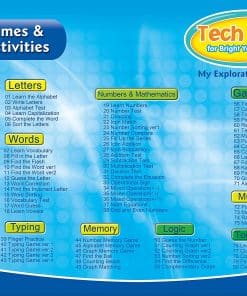 ¡Lleva el aprendizaje educativo avanzado donde quieras con la computadora portátil de aprendizaje para juguetes más avanzada y vanguardista del mercado! La Computadora Portátil de Exploración Tech Kidz My viene con 80 desafiantes juegos y actividades educativas!. ¡Esta computadora portátil infantil totalmente cargada le permite jugar 80 juegos de matemáticas (3 niveles de dificultad matemática), ortografía, lógica, memoria, resolución de problemas y música! ¡Poniendo el edutainment sin problemas y sin problemas al alcance de tus hijos todo el tiempo! Perfectamente compacta, la Computadora Portátil de Exploración es conveniente y portátil para viajes en auto o avión, y cabe en la mayoría de las mochilas.