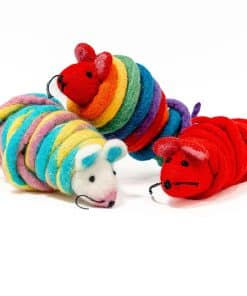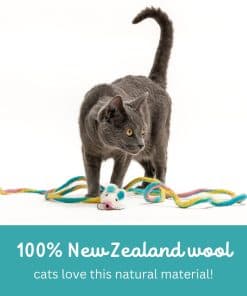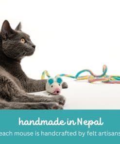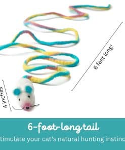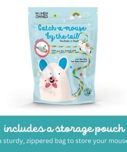 ¿Tu gato es un cazador de corazón ¿A tu pequeño depredador le encanta la emoción del acecho, el drama de la persecución y la alegría del salto Tu gatito puede morder este especial ratón de lana para obtener una mordida satisfactoria, y aún así «vivirá» para jugar otro día.Catch a Mouse by the Tail no es un juguete de ratón ordinario. Está hecho a mano por artesanos en fieltro en Nepal de 100% lana de Nueva Zelanda. Pero la mejor característica de este ratón es su cola de aproximadamente seis pies de longitud. La cola, que se retuerce y enreda, y que sigue a tu gato, es súper emocionante para jugar solo. Pero es aún mejor cuando juegas también. Arrastra este juguete por la cola para simular un roedor que corre, y estimularás el instinto natural de caza de tu gato. Los gatos y gatitos de interior, especialmente, necesitan oportunidades para actuar sus instintos naturales de caza y para obtener el tipo de ejercicio que un juguete como este puede proporcionar. Catch a Mouse by the Tail viene en su propia bolsa con cremallera, que puedes guardar y usar para almacenar este juguete especial cuando no esté en uso.
