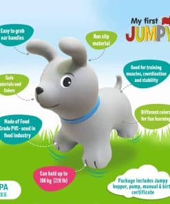 El Saltador de animal inflable de GERARDO’S en forma de Perro Gris mide 22 pulgadas de largo, 11.5 pulgadas de ancho y 19.3 pulgadas de alto, lo que lo convierte en un compañero de juego ideal para tu hijo. El juguete está diseñado para brindar una experiencia de juego animada y divertida, fomentando el crecimiento físico e imaginativo en tu pequeño. Es un regalo activo perfecto para niños pequeños de 2 a 4 años.