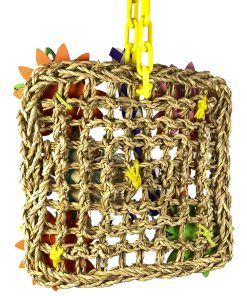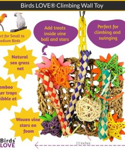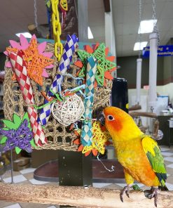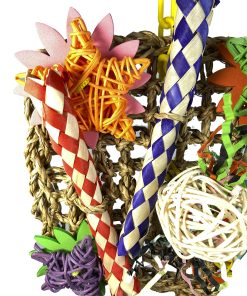Juguete para pájaros Birds LOVE Flower Net Climbing for Small to Medium Birds es un juguete divertido y seguro que ofrecerá a tus pájaros horas de entretenimiento y ejercicio. Hecho de un mat de hierba marina natural con juguetes brillantemente coloreados, como estrellas de vid tejidas en espuma, trampas de dedos de bambú y una bola de vid con confeti, este juguete estimulará los instintos naturales de masticación y forrajeo de tus pájaros. Además, ayudará a reducir el estrés y el aburrimiento al fomentar comportamientos naturales como el desgarre, recoger y limpiar. Este juguete está diseñado especialmente para pájaros pequeños a medianos, como Caiques, Conures del Sol, Mini Guacamayos, Lesser Sulfer Crested, Cockatoos Citron, Cockatoo Goffin, Pionus, Conures Reina de Bavaria, periquitos Quaker y Senegals. Las dimensiones de este juguete son 7.5″ x 7″ x 3, lo que lo convierte en un ajuste perfecto para la jaula de tu pájaro.