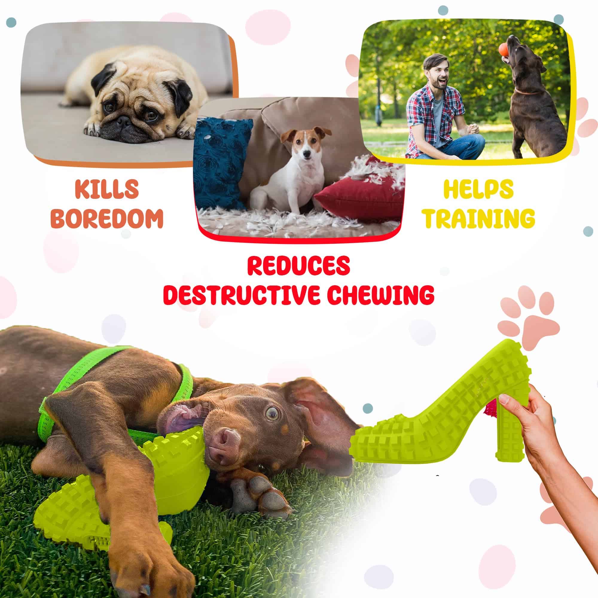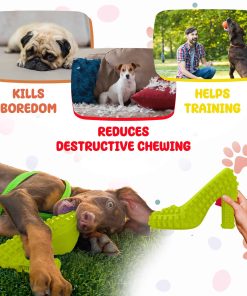 En TOME Dog Toys, nuestra misión es hacer feliz a tu amigo de 4 patas y mantenerlo entretenido durante horas! ¡Estamos trabajando con diseños súper divertidos y materiales de alta calidad para llevarte a tu puerta una amplia selección de juguetes para perros y accesorios diseñados para contribuir a un excelente bienestar al mismo tiempo que proporcionan estimulación óptima y entretenimiento sin fin! Si por alguna razón no estás totalmente satisfecho con tu pedido, ¡no hay de qué preocuparse! ¡Siempre estamos a tu servicio para resolver cualquier problema o inquietud en el menor tiempo posible! Juguete para Perros Divertido y Estimulante Super Shoe para Masticadores Agresivos Tus tacones, zapatos o zapatillas favoritas no se arruinarán más y tu perro seguirá estimulado y entretenido con nuestro juguete masticable para perros en forma de zapato! Este lindo juguete masticable para cachorros tiene una forma realista de zapato diseñada con una textura cuadrada que proporciona estimulación mientras elimina la placa y el sarro y contribuye a encías y dientes saludables! Este juguete interactivo para perros está hecho con goma natural segura para mascotas y no tóxica pero también extremadamente duradera, diseñada para resistir la masticación y la mordedura agresivas! ¿Todavía no estás convencido? ¡Aquí tienes algunas de las increíbles características de nuestro juguete para perros en forma de zapato: Juguetes masticables indestructibles para masticadores agresivos, perros pequeños y medianos; Superficie texturizada cuadrada para estimulación y limpieza dental; Puede ayudar a eliminar sarro, placa y acumulación y refrescar el aliento; Puede ayudar a mantener encías saludables y dientes fuertes; Reducir comportamientos destructivos y masticación agresiva; Resistente y duradero; Hecho con materiales seguros; Puede resistir la fuerza de masticación y mordedura de tus mascotas; Forma divertida de zapato; Puede ayudar a proporcionar estimulación mental y alejar el aburrimiento; ¡Tu mascota amará este juguete para perros divertido y entretenido!