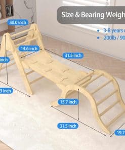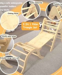 3. Completando el trío está la Rampa Deslizante, un elemento emocionante que agrega una dimensión extra a la experiencia de juego. Los niños pueden subir a la cima del Triángulo Pikler gracias a piezas especiales de contrachapado de escalada y luego descender alegremente por la rampa, desarrollando un sentido de conciencia espacial y dominando el movimiento controlado.
