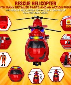 Pasa tiempo de calidad juntos, riendo, jugando y aprendiendo. Este helicóptero de rescate está destinado a ser una fuente de diversión para muchas edades. Detalles y características realistas y detalladas, y viene completo con una mini figura de acción. CaracterísticasPuerta CorredizaGancho de RescateMini Figura de AcciónLuces y SonidosHélices GiratoriasEscalones en la Azotea Horas de DiversiónDimensiones: Helicóptero de Rescate: L 5″ x A 17″ x Al 7″Mini Figura de Acción: A 2″ x Al 4″