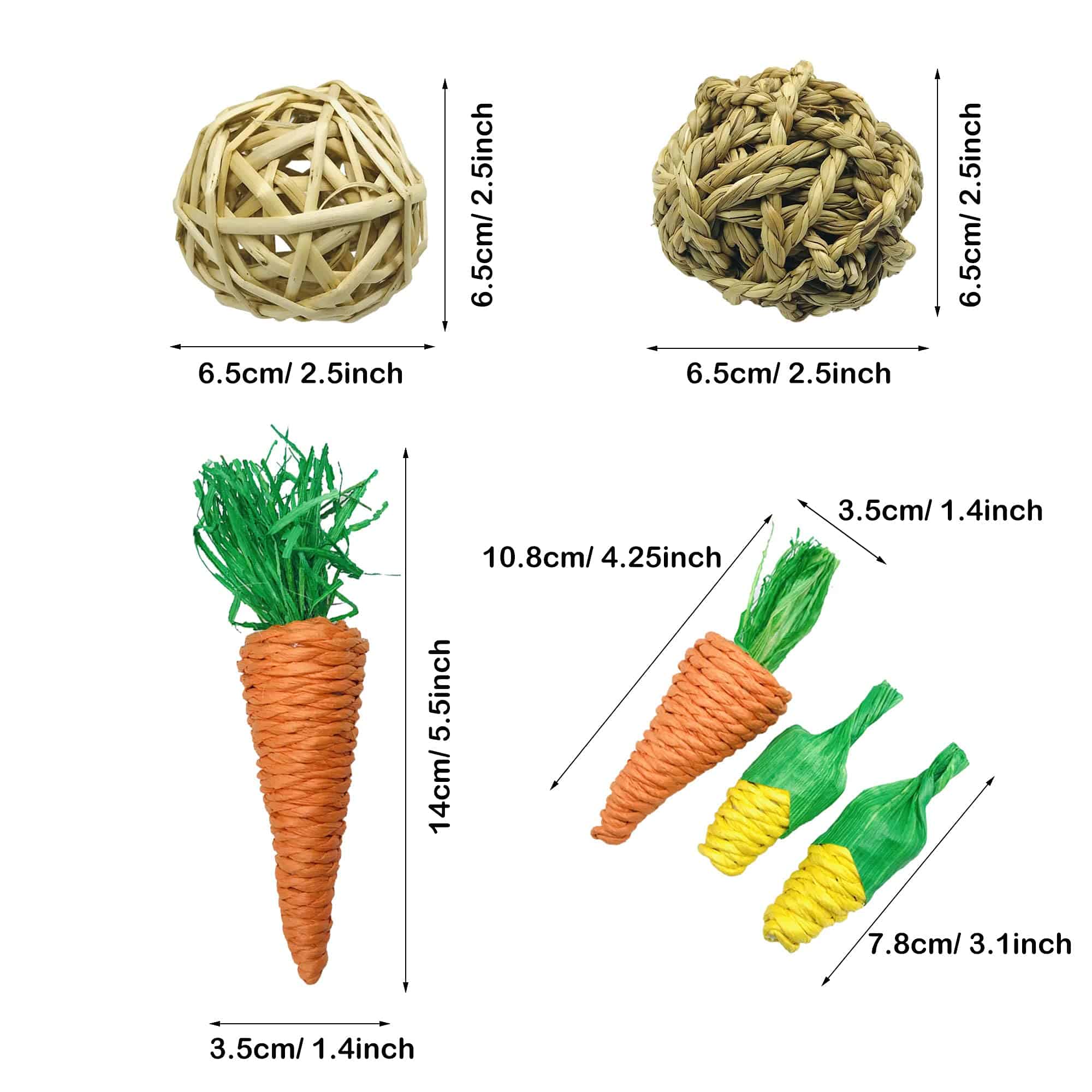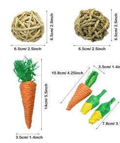 1. Paquete incluye: 1 juguete de zanahoria y 2 juguetes de maíz, 1 rábano blanco, 3 juguetes colgantes, 6 juguetes de loofah, 1 bola de ratán y 1 bola de algas marinas.