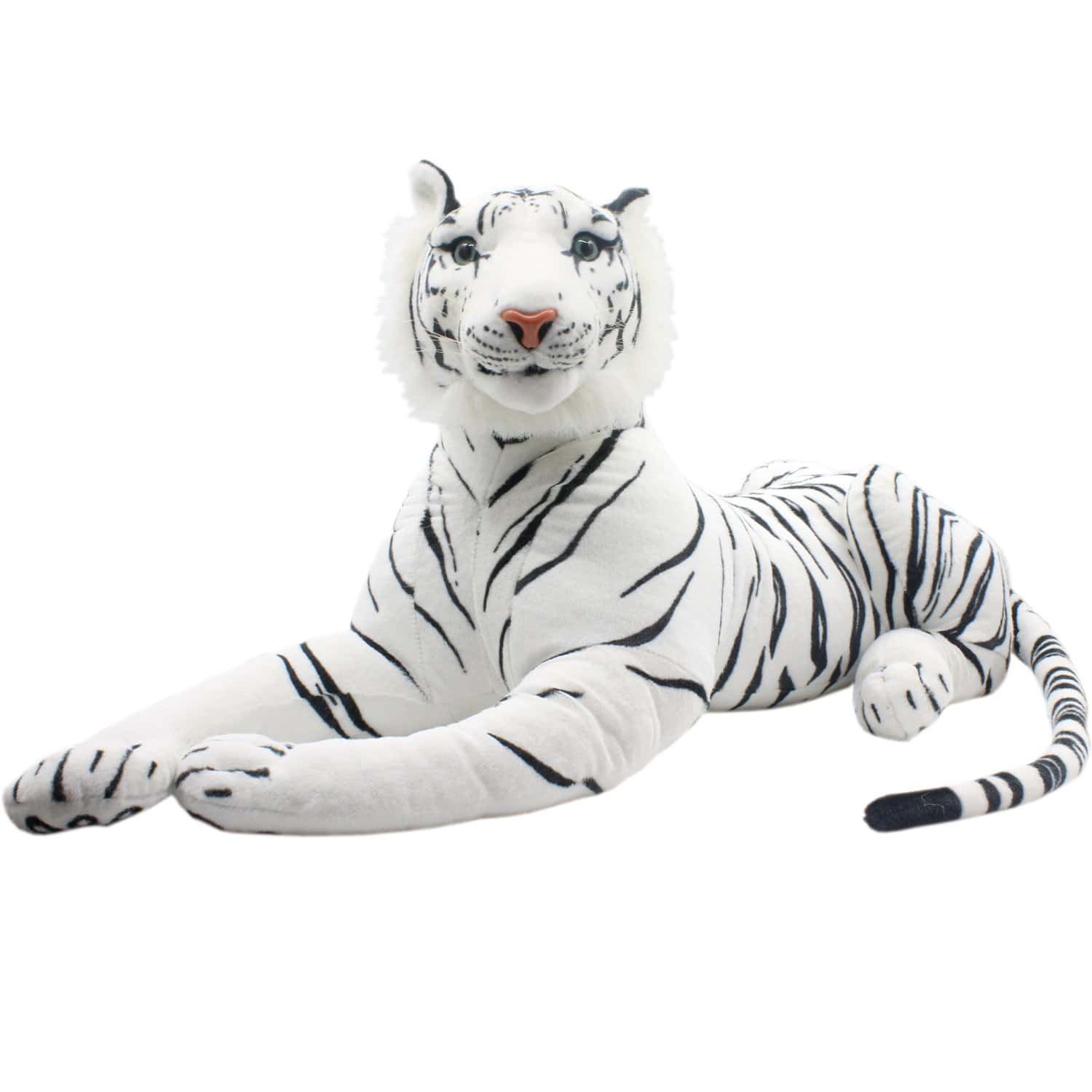 TAGLN Juguetes de Tigres de Peluche Grandes son un juguete perfecto para cualquier amante de los animales. Este tigre de peluche blanco acostado mide 40 pulgadas de largo y está hecho con material de felpa de alta calidad. El relleno de algodón de poliéster le da una sensación suave y esponjosa, mientras que los ojos y la nariz de plástico le dan un aspecto realista. La cabeza tiene un marco de papel en su interior para hacer que el tigre parezca más auténtico. Este juguete de tigre grande es lavable en superficie y cumple con las normas de seguridad internacionales EN71 y ASTM. ¡Lleva a casa a este encantador tigre de peluche de la marca TAGLN y prepárate para abrazarlo y disfrutar de su compañía!