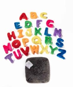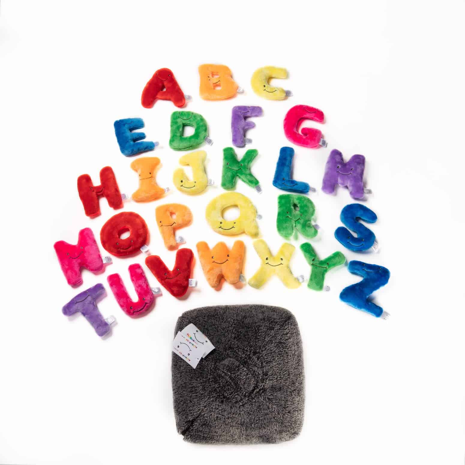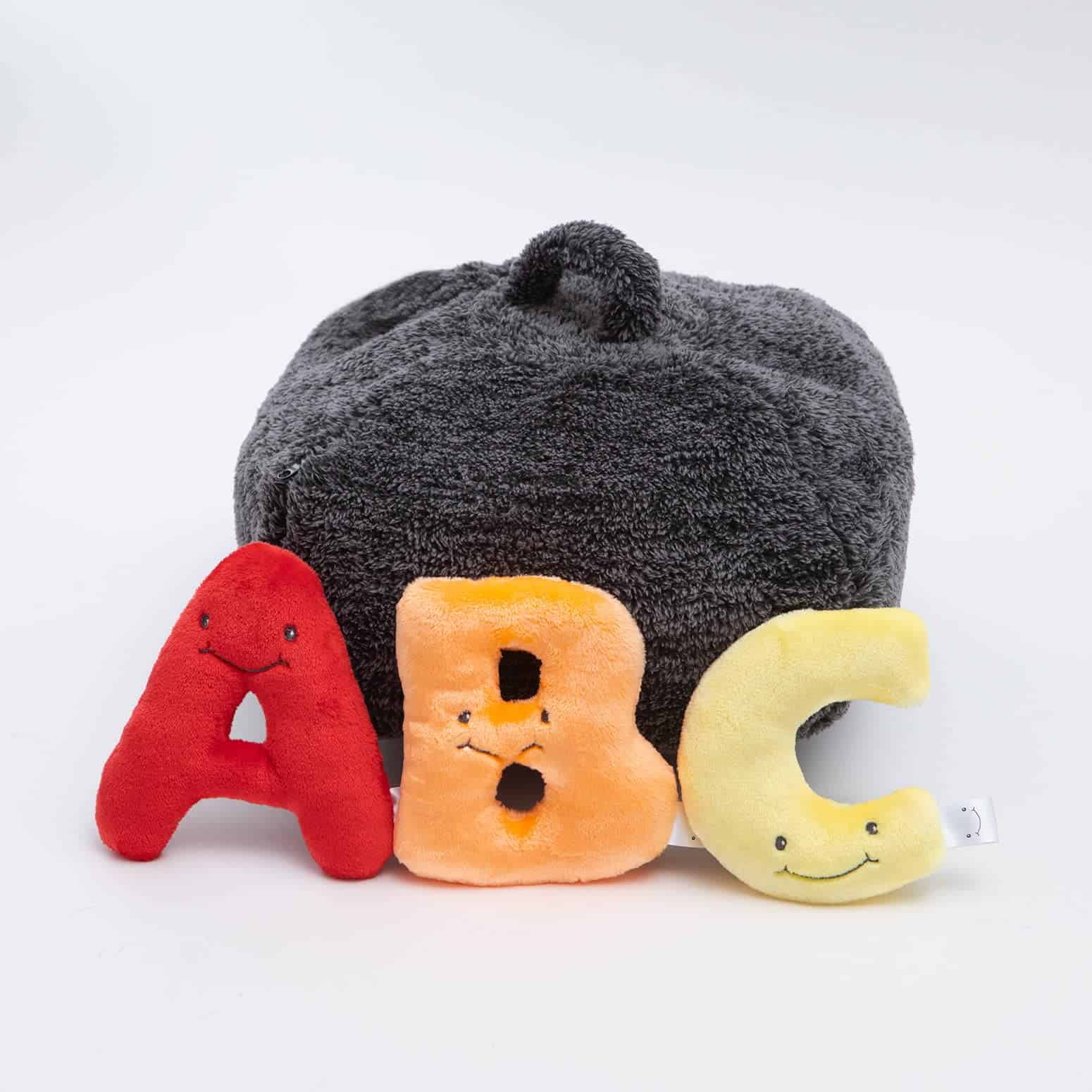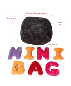 Cada letra está hecha a mano con tela de felpa suave de alta calidad, costuras duraderas y una cara bordada amigable. Todas las letras del abecedario caben en una gran bolsa de felpa que se convierte en una silla acogedora ideal para cualquier sala de juegos o salón de clases.
