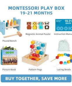 Juguetes Montessori para 18+ Meses – OOOK ha desarrollado una serie de juguetes Montessori, que incluye 5 juguetes básicos (Clavijas de Patrón, Banco Golpeador, Cuentas de Enhebrar, Rompecabezas de Animales Magnéticos, Libro de Imágenes – Pequeño y Grande) para apoyar el desarrollo sensorial de tu bebé en diferentes etapas.
