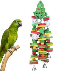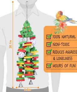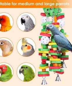 Juguetes para loros GATMAHE, Juguetes Grandes para Loros, Bloque de Madera Natural Multicolor con Campanas para Cotorras Africanas, Guacamayos Medianos, Cacatúas, Loros Amazonas y Loros Eclectus. Juguetes para loros medianos y grandes con tamaño de 20″ ,Adecuado para tus loros como Guacamayos Medianos, Cotorras Africanas, Loros Amazonas, Loros Eclectus, Cacatúas, Periquitos, Cacatúas y Agapornis. Seguro para masticar – Bloques de colores comestibles unidos por una cadena de acero inoxidable, hechos de madera natural y teñidos con pigmentos de color de grado alimenticio. Inodoro, no tóxico y listo para masticar. Brillante y Colorido – Diseñado con colores brillantes y vívidos, por lo que puede atraer fácilmente la atención de las aves. Tus loros pueden divertirse con los juguetes de bloques, como trepar, masticar, deshacer y acicalarse. Recorte de Pico – Estos juguetes masticables para loros ayudan a tu pájaro con el masticado diario y el recorte del pico, necesario para su hábito natural. Menos agresivo, menos destructivo, más activo. Fuerte y Duradero – La parte de hardware está hecha de una cadena de alta calidad que es lo suficientemente resistente para durar mucho tiempo.