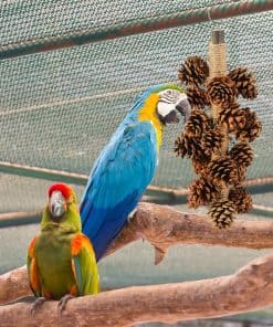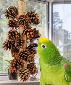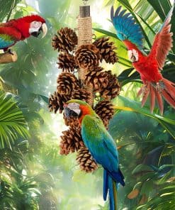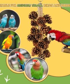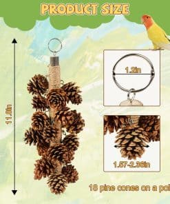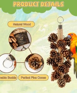 Hecho de madera natural, duraderas piñas de pino y gruesa cuerda de cáñamo, el juguete para pájaros es seguro para los loros. Su pájaro mascota puede jugar libremente con el juguete.