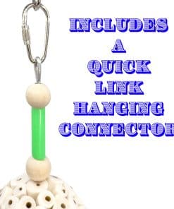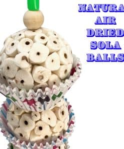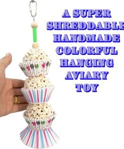 El 1567 Triple Tutu Chew de M&M Bird Toys es un juguete aviario colgante hecho a mano súper triturable. Este juguete está diseñado para entretener picos y patas. En la parte superior del juguete para pájaros se incluye un conector de enlace rápido para colgar rápidamente en la jaula. Un resistente alambre metálico cuelga del conector y continúa a través del centro del juguete funcionando como su columna vertebral. En la parte inferior, este cable hace otro lazo y cuelga una pequeña campana de metal. En la parte superior hay (2) cuentas de madera natural y un tubo de plástico de colores. Estos se colocan en la primera de (3) bolas de madera sola secadas al aire. Estas bolas están hechas de material de la planta sola, se han secado al aire, son completamente naturales y seguras para los pájaros. Cada bola sola se coloca dentro de tazas de pastel de grado de panadería. En la parte inferior hay más tazas mirando hacia abajo. El agradable diseño de este juguete es amado por los pájaros mascota. La sola y las tazas de pastel son muy ligeras, lo que permite que las mascotas de todas las edades y habilidades disfruten. Las bolas de sola son ideales para hurgar con los picos y ofrecen una maravillosa experiencia de búsqueda de comida. Este juguete hecho a mano 100% seguro para pájaros se envía en colores y patrones surtidos para las tazas de pastel. Especificaciones – Altura: (11.5) pulgadas o (29.2) cm Ancho: (3) pulgadas o (7.6) cm Peso: Menos de (2) onzas 100% seguro para pájaros Hecho a mano en nuestro pequeño taller