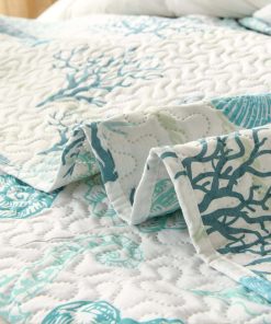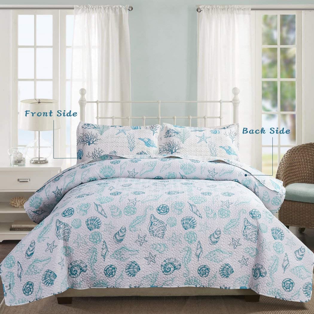 5. Ropa de cama de playa: Juego de cubrecama con diseño temático de océano, conchas, caracoles, estrellas de mar y algas impresas en el juego de colchas, se ve muy hermoso y lindo, el juego de ropa de cama costera te hará sentir de vacaciones todos los días, relájate y ten una buena noche de sueño.