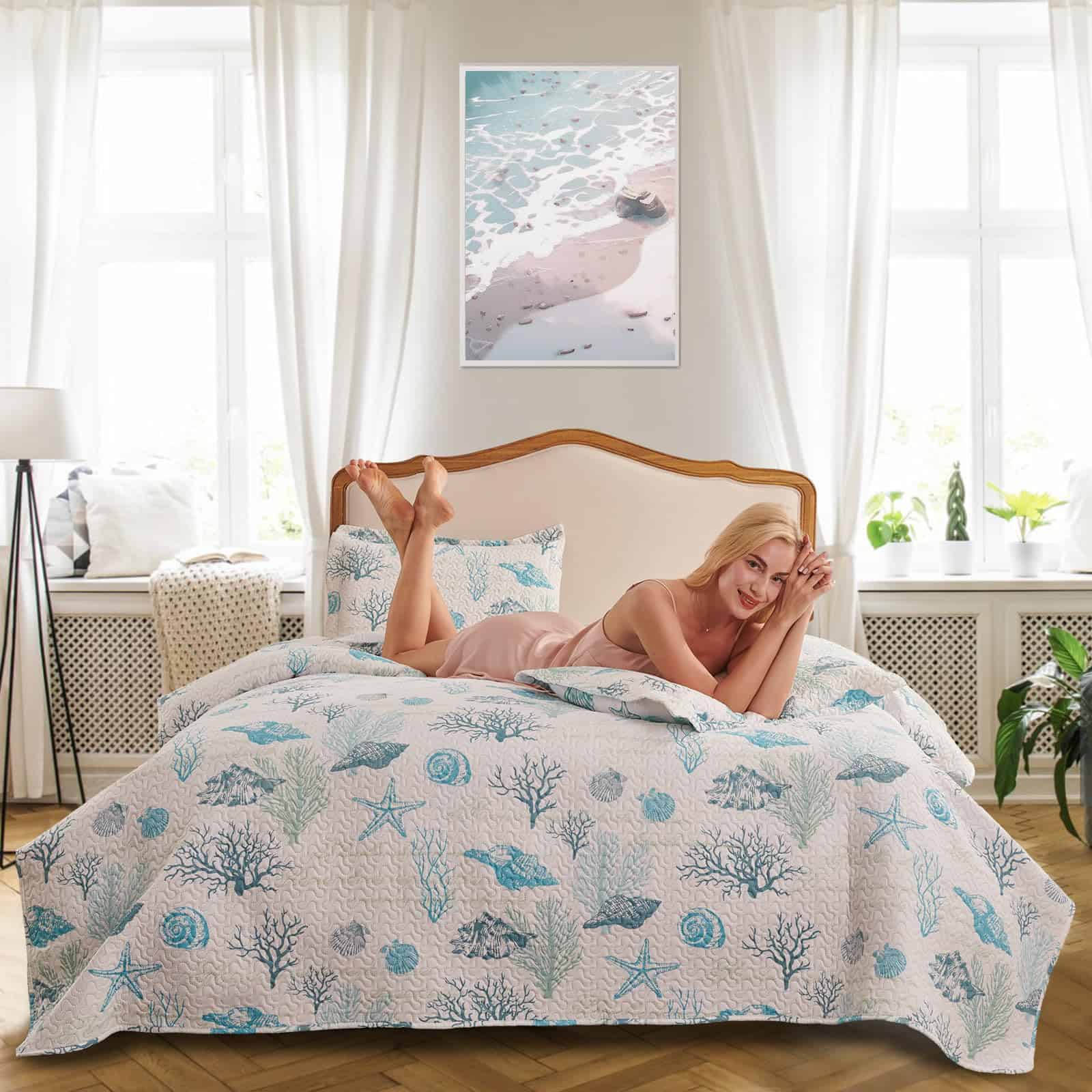 3. Colchas costeras suaves: El material de microfibra suave y acogedor mantiene las colchas muy suaves y cómodas al tacto, te hace dormir mejor y despertar cada mañana sintiéndote renovado y lleno de energía. El cubrecama ligero es perfecto para dormir en noches cálidas de verano, colchas duraderas con costuras y costuras fuertes que se pueden usar durante toda la temporada.