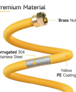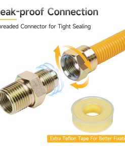 La línea de gas para secadora de 1/2″ OD de JUWO se utiliza para conectar la fuente de suministro de gas a los electrodomésticos de gas, el acero inoxidable corrugado flexible con recubrimiento de PE proporciona alta resistencia, resistencia óptima a la corrosión, y durabilidad, y se dobla libremente sin torcerse o rizarse. Especificaciones Diámetro de la línea: 1/2 pulgada Longitud de la línea: 72 pulgadas BTU: 49,100 Tipo de Parte de Fontanería: Conector de Gas Material: Acero Inoxidable Durabilidad: Resistente al óxido, Resistente a fugas Aplicación: Para Secadoras de Gas, Estufas de Gas, Cocinas de Gas, Calentadores de Agua y más Electrodomésticos NG/LPG Rango de Presión: 0.3Mpa a 1.6Mpa Rango de Temperatura: -22 F a 248 F (-30 a 120 ) Paquete Incluido: 1Pcs Línea de Gas, 2Pcs Adaptadores (1/2 MIP, 1/2 FIP) Consejos Útiles 1. Los conectores y accesorios están diseñados solo para instalación original y no deben ser reutilizados en otros electrodomésticos de gas o en otras ubicaciones. 2. Por favor, corte el suministro de aire antes de comenzar a trabajar. 3. Apriete la conexión con una llave de tubo y revise la presencia de fugas con una prueba de jabón. 4. No doble o gire excesivamente la línea de gas, ni la fuerce en su lugar. 5. Mantenga las líneas de gas alejadas de fuentes de calor, objetos afilados y cables eléctricos.