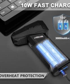 2. Potente Soplador con Ventilador de Ducto de Alta Velocidad 3 ajustes de flujo de aire ajustables, que le permiten personalizar el flujo de aire para satisfacer diferentes necesidades de limpieza. Proporciona una limpieza eficiente. Batería de gran capacidad incorporada (la batería está equipada con protección de temperatura, protección de corriente y protección contra cortocircuitos). Y admite carga rápida de 10 W.