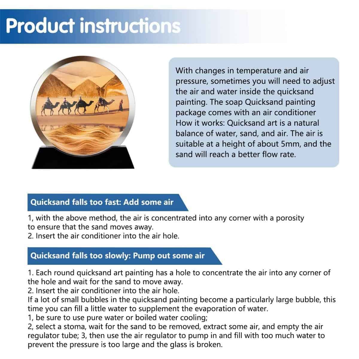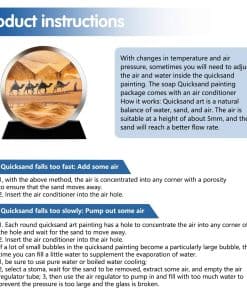 4. DECORACIÓN EXCELENTE La pintura de arena en movimiento, muy adecuada para sala de estar, dormitorio, tocador, estudio, escritorio, trabajo o al lado de la computadora, el movimiento de arena puede aliviar el estrés, aliviar emociones, relajar los ojos, cultivar la paciencia, creo que te gustará. Nuestro producto está equipado con jeringa esterilizada, es fácil de operar, puedes ajustar libremente el volumen de aire y la velocidad de la arena movediza.