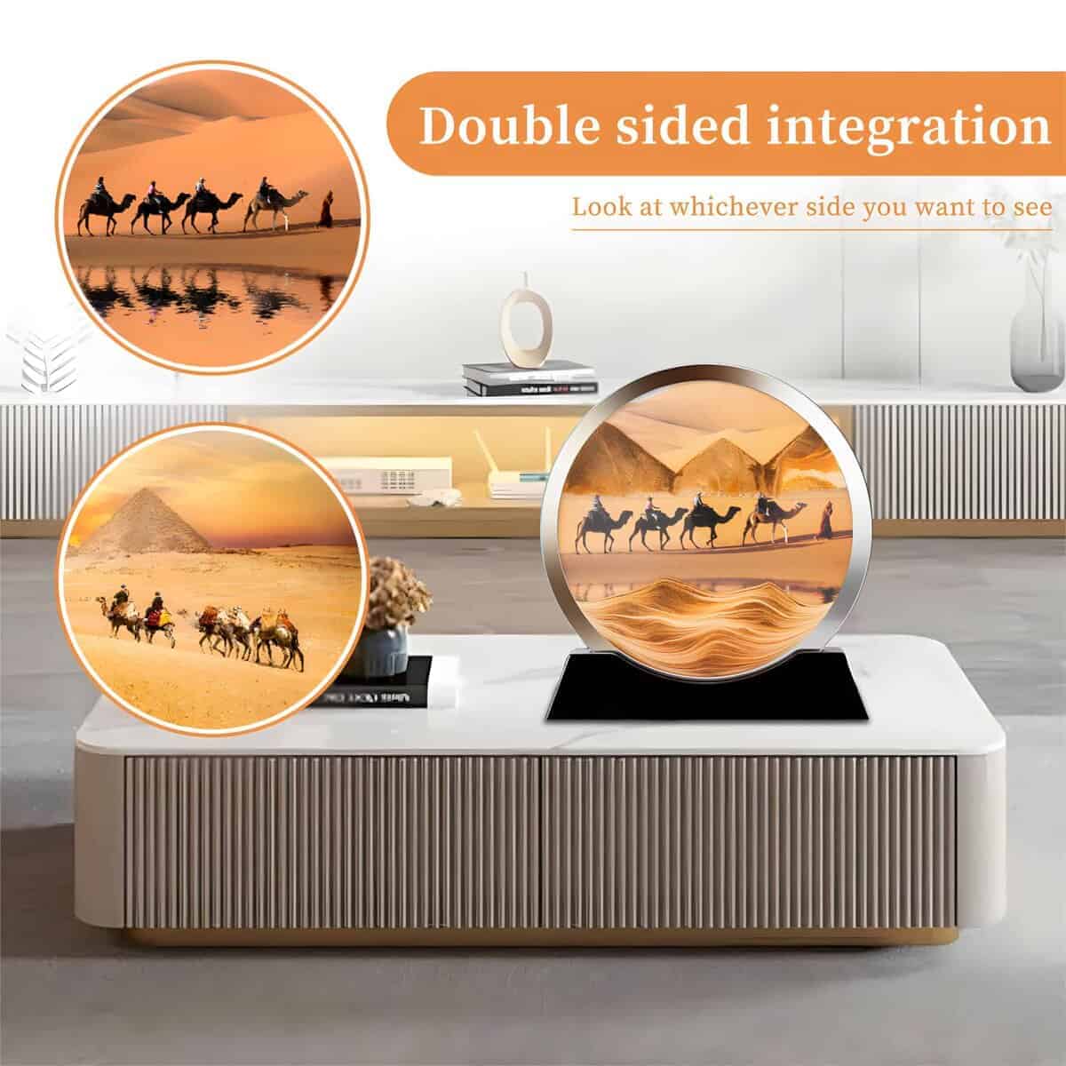 1. DOBLE LADO MEJORADO DE ARTE DE ARENA EN MOVIMIENTO diseño de arte de arena en espejo de doble cara, cada lado tiene arena y fondo diferentes. Comprar uno equivale a obtener 2 fabricantes de arte de arena diferentes al mismo tiempo. Cada vez que lo voltees, obtendrás una nueva y diferente pieza de ‘arte’, permitiéndote disfrutar completamente de la diversión de la arena movediza.