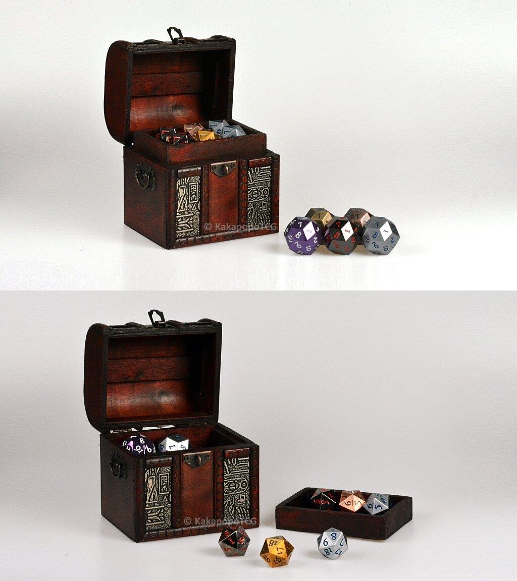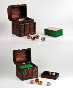El Elven Chest (Diseño – Chainmail) es una Caja de Madera con Cerradura para Guardar Cartas de Juegos con un compartimento separado para dados. ¡Viene con cerradura de metal y llave!