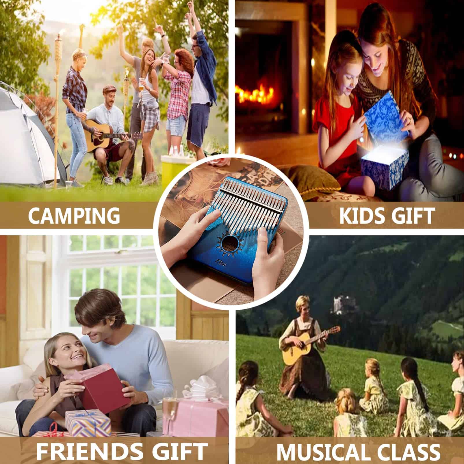 Kalimba se usa principalmente para acompañar cantos. Al tocar, necesitas sostener el cuerpo con ambas manos y luego jugar con dos pulgares. Cuando los pulgares se presionan y se sueltan, la lámina de acero vibrará y hará un sonido. Kalimba es pequeño y fácil de llevar. Muchas personas lo llevarán para pasar el tiempo en el camino. Además, las características de sonido de Kalimba son etéreas y claras, similares al octavo de caja, pero más transparente. Es un buen regalo para el ocio, entretenimiento y evolución. También es un instrumento musical de nivel de entrada para los amantes de la música.